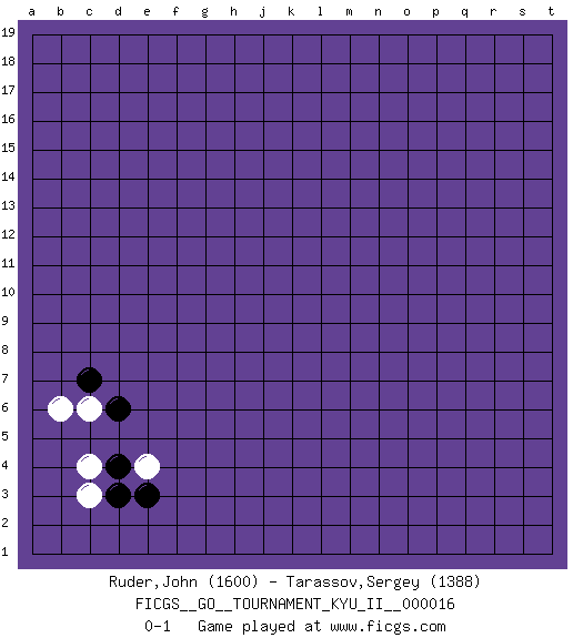 Last move : 0-1 2010 February 1 8:43:22 [Event "FICGS__GO__TOURNAMENT_KYU_II__000016"] [Site "FICGS"] [Date "2009.12.26"] [Round "1"] [Black "Ruder,John"] [White "Tarassov,Sergey"] [Result "0-1"] [Rating 1 "1600"] [Rating 2 "1388"] 1.e3 c4 2.d6 e4 3.d4 c3 4.d3 c6 5.c7 b6 0-1 This go game has been lost on time (started : 2009.12.26 10:2:27) Here are the names of the openings (joseki) played in the four corners : Corner d4 : e3 c4 Mokuhazushi (Waemok, Wai`mu`) 5-3 Point. The mokuhazushi (5-3) point was popular in the Edo period in Japan (1600 - 1867). It emphasizes influence; territorially, it is inferior to the 3-4 point. Komoku Kakari. White 2 is the standard approach because of its solidity and stability. Player White won this Go (weiqi, baduk) game. Follow this game move after move (download)One big eye kills one small eye. (Anonymous) Lamb in skin of tiger, still fears the wolf. (Chinese proverb)