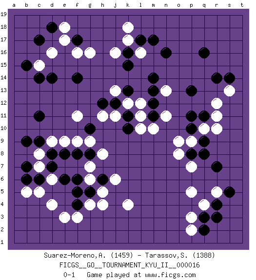 Last move : 0-1 2010 April 10 20:50:18 [Event "FICGS__GO__TOURNAMENT_KYU_II__000016"] [Site "FICGS"] [Date "2009.12.26"] [Round "1"] [Black "Suarez-Moreno,Alejandro"] [White "Tarassov,Sergey"] [Result "0-1"] [Rating 1 "1459"] [Rating 2 "1388"] 1.q16 d4 2.q3 d16 3.c14 c15 4.d14 g16 5.c11 r5 6.r7 p5 7.r4 p7 8.q9 p3 9.s5 q4 10.r3 k4 11.n16 r12 12.r14 q10 13.q11 r11 14.p10 r10 15.p11 p9 16.p8 o9 17.q8 o8 18.p13 c7 19.f4 h4 20.f6 e3 21.e8 d9 22.b9 e9 23.d8 c8 24.c9 f3 25.f8 f11 26.f14 h11 27.f17 f16 28.c17 e17 29.b15 h8 30.c6 d6 31.d7 c5 32.b6 b5 33.b7 k17 34.l17 l16 35.m17 n11 36.k16 j16 37.k15 s13 38.s14 k18 39.k13 n13 40.m14 p2 41.q2 f9 42.k11 l12 43.m12 k12 44.m13 l11 45.m11 m10 46.d18 e18 47.h6 g7 48.e6 g6 49.g5 h5 50.g8 g4 51.f5 j6 52.g10 g9 53.j12 j11 54.k10 j13 55.h12 l10 0-1 This go game has been lost on time (started : 2009.12.26 10:2:27) Here are the names of the openings (joseki) played in the four corners : Corner d16 : d16 c14 Hoshi (Hwajeom, Seongjeom, Xingwei`) 4-4 Point. The star or hoshi (4-4) point, emphasizing influence at the potential expense of territory. Ikken Kakari (Hankan Keolch'im, Yi Gua`jiao~, 1-Space Low Approach). Black 2 is the standard approach move to the 4-4. Corner q4 : q3 r5 Komoku (Somok, Xiao~mu`) 3-4 Point. The komoku (3-4) point is the traditional corner enclosure move.. Ikken Kakari (Hankan Keolch'im, Yi Gua`jiao~, 1-Space Low Pincer). The small knight move is the basic approach move to the 3-4 point stone. It has been continually used for over four centuries. There are limitless variations, with new moves constantly being discovered. White 2 opens the door to a treaure store of joseki. Player White won this Go (weiqi, baduk) game. Follow this game move after move (download)Go is to western chess what philosophy is to double entry accounting. (from Shibumi, by Trevanian) Art is the triumph over chaos. (John Cheever)