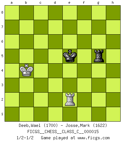 Last move : 1/2-1/2 2007 July 11 17:24:10 [Event "FICGS__CHESS__CLASS_C__000015"] [Site "FICGS"] [Date "2006.10.12"] [Round "1"] [White "Deeb,Wael"] [Black "Josse,Mark"] [Result "1/2-1/2"] [WhiteElo "1700"] [BlackElo "1622"] 1.e4 c5 2.c3 Nf6 3.e5 Nd5 4.d4 cxd4 5.Nf3 e6 6.cxd4 d6 7.Bc4 Nc6 8.O-O Be7 9.Qe2 O-O 10.Nc3 Nxc3 11.bxc3 dxe5 12.dxe5 Qa5 13.Qe4 Qa4 14.Bg5 h6 15.Bxe7 Nxe7 16.Rab1 Rb8 17.Rb4 Qc6 18.Qe3 b6 19.Bd3 Nf5 20.Bxf5 exf5 21.Nd4 Qg6 22.Nb5 Bb7 23.f3 Ba6 24.Rd1 Bxb5 25.Rd6 f4 26.Qxf4 Qc2 27.Rxb5 Qxa2 28.Rb4 Qa1+ 29.Kf2 Qxc3 30.Rc4 Qb2+ 31.Kg3 Rbe8 32.Rcd4 Re6 33.Qe4 a5 34.h4 b5 35.Rxe6 fxe6 36.Rd6 Qb3 37.Qg4 Qc4 38.Rxe6 Qxg4+ 39.Kxg4 Ra8 40.Rb6 a4 41.Rxb5 a3 42.Rb1 a2 43.Ra1 Kf7 44.Kf5 g6+ 45.Ke4 Ke6 46.f4 Ra4+ 47.Kd3 Kf5 48.g3 Ra8 49.Kc3 Ra3+ 50.Kc4 g5 51.fxg5 hxg5 52.hxg5 Kxe5 53.Kb4 Rxg3 54.Rxa2 Rxg5 55.Re2+ 1/2-1/2 Sicilian : Alapin's variation (2.c3) Kingside Castling by player White (move 8) Kingside Castling by player Black (move 9) 10 pieces endgame at move 51 : White KRPPPP , Black KRPP WHITE : King + 1 Rook 4 Pawns BLACK : King + 1 Rook 2 Pawns 9 pieces endgame at move 51 : White KRPPP , Black KRPP WHITE : King + 1 Rook 3 Pawns BLACK : King + 1 Rook 2 Pawns 8 pieces endgame at move 52 : White KRPPP , Black KRP WHITE : King + 1 Rook 3 Pawns BLACK : King + 1 Rook 1 Pawn 7 pieces endgame at move 52 : White KRPP , Black KRP WHITE : King + 1 Rook 2 Pawns BLACK : King + 1 Rook 1 Pawn 6 pieces endgame at move 53 : White KRP , Black KRP WHITE : King + 1 Rook 1 Pawn BLACK : King + 1 Rook 1 Pawn 5 pieces endgame at move 54 : White KRP , Black KR WHITE : King + 1 Rook 1 Pawn BLACK : King + 1 Rook 4 pieces endgame at move 54 : White KR , Black KR WHITE : King + 1 Rook BLACK : King + 1 Rook This chess game ended in a draw. Follow this game move after move (download)Fischer, who may or may not be mad as a hatter, has every right to be horrified. (Jeremy Silman) Alles was ich jemals tun will ist Schach spielen. (Robert James Fischer) No existe un remordimiento como el remordimiento del Ajedrez. (H. G. Wells) L'action d'une oeuvre littéraire se déroule sur un champ de bataille. Les masques et les types du drame moderne correspondent aux pièces du jeu d'échecs. L'intrigue correspond aux coups et aux gambits, c'est à dire aux techniques du jeu telles qu'utilisées et interprétées par les joueurs. Les tactiques et les péripéties [mouvements] correspondent aux coups exécutés par l'adversaire. (Viktor Shklovsky) When you stop learning you start dying. (M. Scott Adams)