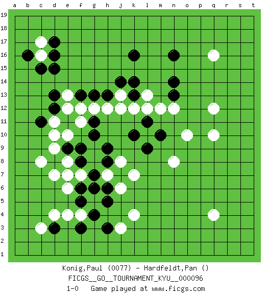 Last move : 1-0 2010 May 1 11:20:30 [Event "FICGS__GO__TOURNAMENT_KYU__000096"] [Site "FICGS"] [Date "2009.12.26"] [Round "1"] [Black "Konig,Paul"] [White "Hardfeldt,Pan"] [Result "1-0"] [Rating 1 "0077"] 1.k10 d4 2.g6 e6 3.f8 d9 4.e11 d11 5.d12 e10 6.c11 d10 7.f9 q4 8.d8 f11 9.g11 e12 10.d13 e13 11.d15 g12 12.g10 c8 13.e9 d7 14.e7 e8 15.f6 f7 16.g7 e7 17.h13 q10 18.g13 h12 19.f13 f12 20.k16 f4 21.g4 k4 22.f3 g5 23.f5 e4 24.d3 q16 25.h5 q12 26.n14 j13 27.j14 l13 28.k13 k12 29.k14 j12 30.n13 m12 31.l11 l12 32.m10 n12 33.n16 c16 34.d16 c17 35.c15 o10 36.l9 n8 37.d17 j3 38.h3 k7 39.j7 j6 40.h8 j8 41.h6 h7 42.h9 c3 43.b16 1-0 Here are the names of the openings (joseki) played in the four corners : Corner d4 : d4 g6 Hoshi (Hwajeom, Seongjeom, Xingwei`) 4-4 Point. The star or hoshi (4-4) point, emphasizing influence at the potential expense of territory. Corner d16 : e11 d11 This joseki is unknown. A weak or weird move has probably been played in this corner. Corner q4 : q4 l9 Hoshi (Hwajeom, Seongjeom, Xingwei`) 4-4 Point. The star or hoshi (4-4) point, emphasizing influence at the potential expense of territory. Player Black won this Go (weiqi, baduk) game. Follow this game move after move (download)If you lose by one point, take a rest. (Anonymous) The only thing that matters is the evidence. (Horatio Caine, C.S.I. Miami)