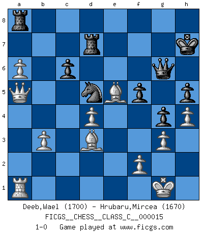 Last move : 1-0 2007 March 30 11:38:14 [Event "FICGS__CHESS__CLASS_C__000015"] [Site "FICGS"] [Date "2006.10.12"] [Round "1"] [White "Deeb,Wael"] [Black "Hrubaru,Mircea"] [Result "1-0"] [WhiteElo "1700"] [BlackElo "1670"] 1.e4 e5 2.Nf3 Nc6 3.Bb5 a6 4.Ba4 Nf6 5.O-O Be7 6.Re1 b5 7.Bb3 O-O 8.c3 d5 9.exd5 Nxd5 10.Nxe5 Nxe5 11.Rxe5 c6 12.d4 Bd6 13.Re1 Qh4 14.g3 Qh3 15.Re4 g5 16.Qe2 Bf5 17.Nd2 Bxe4 18.Nxe4 Qe6 19.Qf3 f6 20.Bd2 g4 21.Qd3 f5 22.Nxd6 Qxd6 23.Bf4 Qe6 24.Be5 Rf7 25.c4 Nb4 26.Qf1 bxc4 27.Bxc4 Nd5 28.Bxa6 Re7 29.Bc4 h6 30.a4 Rea7 31.b3 h5 32.h4 Qg6 33.Qe1 Kh7 34.a5 Rd7 35.a6 Nb6 36.Bd3 Nd5 37.Qa5 1-0 Ruy Lopez : Closed, 7...O-O Kingside Castling by player White (move 5) Kingside Castling by player Black (move 7) Player White won this chess game. Follow this game move after move (download)Chess is a fairy tale of 1001 blunders. (Savielly Tartakower) Schach ist Leben. (Robert James Fischer) Bobby solo arroja las piezas y solas caen en las casillas correctas. (Miguel Najdorf ) Les erreurs sont comme les malheurs, elles n'arrivent jamais seules. (Siegbert Tarrasch) The problem with troubleshooting is that trouble shoots back. (Anonymous)