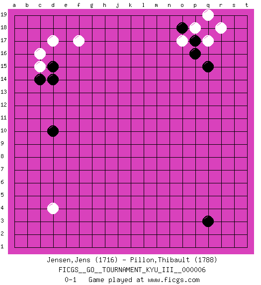 Last move : 0-1 2010 February 18 8:57:25 [Event "FICGS__GO__TOURNAMENT_KYU_III__000006 "] [Site "FICGS"] [Date "2009.12.28"] [Round "1"] [Black "Jensen,Jens "] [White "Pillon,Thibault "] [Result "0-1"] [Rating 1 "1716"] [Rating 2 "1788"] 1.q15 d4 2.q3 d17 3.d15 c15 4.c14 c16 5.d14 f17 6.d10 q17 7.p17 p18 8.p16 o17 9.q18 r18 10.o18 q19 0-1 This go game has been lost on time (started : 2009.12.28 10:56:52) Here are the names of the openings (joseki) played in the four corners : Corner d16 : d17 d15Komoku (Somok, Xiao~mu`) 3-4 Point. The komoku (3-4) point is the traditional corner enclosure move..Ikken Takagakari (Hankan Nop'dakeolch'im, Yi Gaogua`jiao~, 1-Space High Approach). The 5-4 approach move has become more popular in modern times, as modern Go emphasizes speed and influence. Corner q16 : q15 q17Takamoku (Gomok, Gaomu`) 5-4 Point. The takamoku (high) point (5-4). With its emphasis on influence, the 5-4 point complements the 4-4 (hoshi) point in creating an influence-oriented fuseki.Komoku. Black responds with 3-3, 3-5, 4-6, 4-7, 3-6, 3-7. Player White won this Go (weiqi, baduk) game.Follow this game move after move (download ) Do not fear furikawari. (Anonymous) He who defends everything defends nothing. (Frederick the Great)