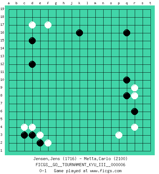 Last move : 0-1 2010 February 19 21:2:39 [Event "FICGS__GO__TOURNAMENT_KYU_III__000006"] [Site "FICGS"] [Date "2009.12.28"] [Round "1"] [Black "Jensen,Jens"] [White "Metta,Carlo"] [Result "0-1"] [Rating 1 "1716"] [Rating 2 "2100"] 1.q16 d4 2.d15 r4 3.q10 d17 4.k16 f17 5.r6 p3 6.d12 r8 7.q8 r9 8.c3 c4 9.d3 e3 10.e2 f2 0-1 This go game has been lost on time (started : 2009.12.28 10:56:52) Here are the names of the openings (joseki) played in the four corners : Corner d16 : d15 d17 Takamoku (Gomok, Gaomu`) 5-4 Point. The takamoku (high) point (5-4). With its emphasis on influence, the 5-4 point complements the 4-4 (hoshi) point in creating an influence-oriented fuseki. Komoku. Black responds with 3-3, 3-5, 4-6, 4-7, 3-6, 3-7. Corner q4 : r4 r6 Komoku (Somok, Xiao~mu`) 3-4 Point. The komoku (3-4) point is the traditional corner enclosure move.. Corner d4 : d4 c3 Hoshi (Hwajeom, Seongjeom, Xingwei`) 4-4 Point. The star or hoshi (4-4) point, emphasizing influence at the potential expense of territory. Player White won this Go (weiqi, baduk) game. Follow this game move after move (download)There is damezumari at the bamboo joint. (Anonymous) A government big enough to give you everything you want is strong enough to take everything you have. (Thomas Jefferson)