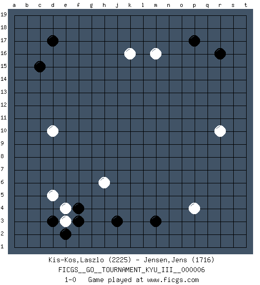 Last move : 1-0 2010 February 21 9:15:19 [Event "FICGS__GO__TOURNAMENT_KYU_III__000006"] [Site "FICGS"] [Date "2009.12.28"] [Round "1"] [Black "Kis-Kos,Laszlo"] [White "Jensen,Jens"] [Result "1-0"] [Rating 1 "2225"] [Rating 2 "1716"] 1.r16 p4 2.d17 d5 3.c15 d10 4.p17 r10 5.j3 h6 6.m3 k16 7.d3 m16 8.f4 e4 9.f3 e3 10.e2 1-0 This go game has been lost on time (started : 2009.12.28 10:56:52) Here are the names of the openings (joseki) played in the four corners : Corner d4 : d5 j3 Takamoku (Gomok, Gaomu`) 5-4 Point. The takamoku (high) point (5-4). With its emphasis on influence, the 5-4 point complements the 4-4 (hoshi) point in creating an influence-oriented fuseki. Corner q4 : p4 m3 Takamoku (Gomok, Gaomu`) 5-4 Point. The takamoku (high) point (5-4). With its emphasis on influence, the 5-4 point complements the 4-4 (hoshi) point in creating an influence-oriented fuseki. Player Black won this Go (weiqi, baduk) game. Follow this game move after move (download)Balance is not what players strike for, and if it does arise, it is in spite of them. (Pierre Audouard) Home computers are being called upon to perform many new functions, including the consumption of homework formerly eaten by the dog. (Doug Larson)
