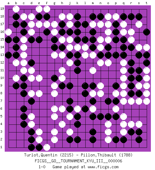 Last move : 1-0 2010 January 27 23:18:52 [Event "FICGS__GO__TOURNAMENT_KYU_III__000006"] [Site "FICGS"] [Date "2009.12.28"] [Round "1"] [Black "Turlot,Quentin"] [White "Pillon,Thibault"] [Result "1-0"] [Rating 1 "2215"] [Rating 2 "1788"] 1.d15 q4 2.d3 q17 3.k17 d17 4.f16 c15 5.c16 d16 6.c17 c18 7.b18 d18 8.b15 c14 9.b14 c13 10.e15 b19 11.b17 g17 12.h16 c11 13.b13 b12 14.d12 c12 15.a13 h18 16.f18 f17 17.e18 e17 18.h17 j18 19.k18 g16 20.g15 h15 21.g14 e19 22.k15 f19 23.c8 d10 24.g10 d8 25.d7 e8 26.c9 e10 27.c6 g9 28.q15 r15 29.r14 r16 30.q13 o17 31.r9 r7 32.p9 g3 33.p2 o3 34.r3 q3 35.q2 r4 36.s3 o2 37.k4 g6 38.o5 o4 39.n5 s4 40.s2 k6 41.h9 g8 42.h5 g5 43.j7 h6 44.j6 j5 45.k5 h4 46.l6 p14 47.q14 o15 48.p16 o16 49.p17 p18 50.q18 q16 51.p15 o18 52.r18 s17 53.s18 s14 54.s13 t14 55.t16 h10 56.j9 h11 57.k11 j15 58.j16 h13 59.h14 j14 60.j13 k14 61.l15 l14 62.m14 j12 63.k13 l13 64.k12 m13 65.n13 n14 66.m15 n12 67.o13 m11 68.o14 j17 69.k16 n15 70.m18 m17 71.n18 n17 72.m16 g13 73.l17 o12 74.p13 q10 75.r10 q9 76.r8 q11 77.r11 q8 78.l9 m8 79.m9 n8 80.l8 n9 81.m3 q12 82.r12 d5 83.c5 d4 84.c4 e3 85.d2 e2 86.e1 s7 87.j2 m6 88.m5 t10 89.t9 s9 90.s8 t8 91.s10 t11 92.t9 a16 93.a15 s9 94.t12 t9 95.s11 t7 96.t13 b10 97.b9 p6 98.o7 p8 99.m2 f1 100.d1 g2 101.c10 d11 102.p5 q5 103.p7 q7 104.m7 j3 105.k2 1-0 Here are the names of the openings (joseki) played in the four corners : Corner d16 : d15 d17 Takamoku (Gomok, Gaomu`) 5-4 Point. The takamoku (high) point (5-4). With its emphasis on influence, the 5-4 point complements the 4-4 (hoshi) point in creating an influence-oriented fuseki. Komoku. Black responds with 3-3, 3-5, 4-6, 4-7, 3-6, 3-7. Corner q16 : q17 q15 Komoku (Somok, Xiao~mu`) 3-4 Point. The komoku (3-4) point is the traditional corner enclosure move.. Ikken Takagakari (Hankan Nop'dakeolch'im, Yi Gaogua`jiao~, 1-Space High Approach). The 5-4 approach move has become more popular in modern times, as modern Go emphasizes speed and influence. Corner q4 : q4 r9 Hoshi (Hwajeom, Seongjeom, Xingwei`) 4-4 Point. The star or hoshi (4-4) point, emphasizing influence at the potential expense of territory. Player Black won this Go (weiqi, baduk) game. Follow this game move after move (download)On the third line, four die, six live. (Anonymous) If you are good, you will be assigned all the work. If you are really good, you will get out of it. (Dan Rotaru)