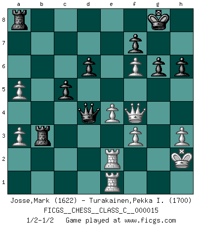 Last move : 1/2-1/2 2007 March 12 0:30:49 [Event "FICGS__CHESS__CLASS_C__000015"] [Site "FICGS"] [Date "2006.10.12"] [Round "1"] [White "Josse,Mark"] [Black "Turakainen,Pekka I."] [Result "1/2-1/2"] [WhiteElo "1622"] [BlackElo "1700"] 1.e4 e5 2.Nf3 Nc6 3.Bc4 Nf6 4.d3 Bc5 5.c3 d6 6.O-O O-O 7.Bb3 a6 8.Nbd2 Ba7 9.h3 Be6 10.Re1 Bxb3 11.Qxb3 Rb8 12.Nf1 h6 13.Ng3 Qd7 14.Be3 Bxe3 15.Rxe3 Ne7 16.d4 exd4 17.cxd4 Rfe8 18.d5 c6 19.dxc6 bxc6 20.Qc2 Ng6 21.Rc1 c5 22.Rd1 Qe6 23.b3 Rbd8 24.a3 Nf4 25.Ne1 Rb8 26.Nd3 Nxd3 27.Qxd3 Rb6 28.Nf1 Nh5 29.Qe2 Nf4 30.Qf3 Ng6 31.Nd2 a5 32.Qg3 a4 33.bxa4 Ra8 34.f4 Qa2 35.f5 Ne5 36.Nf3 Qc2 37.Rde1 Nc4 38.f6 g6 39.R3e2 Qc3 40.Qf4 Ne5 41.a5 Nxf3 42.gxf3 Qd4+ 43.Kh2 Rb3 1/2-1/2 Two knights defense (Modern Bishop's Opening) Kingside Castling by player White (move 6) Kingside Castling by player Black (move 6) This chess game ended in a draw. Follow this game move after move (download)I prefer to lose a really good game than to win a bad one. (David Levy) Moralische Siege zählen nicht. (Savielly Grigorievitsch Tartakower) Cuando me preguntan: -¿Cual es el secreto que te hace hacer mejores movidas que tus oponentes?, Yo respondo: Me da gusto que me pregunten eso, porque, como veran, hay una simple razón. Yo pienso mis propias movidas y dejo a mi oponente que el piense las suyas. (Alexander Alekhine) Les ravages du H expliquent la différence de niveau entre Tal et Thal [Abergel]. Don't be discouraged. It's often the last key in the bunch that opens the lock. (Author unknown)