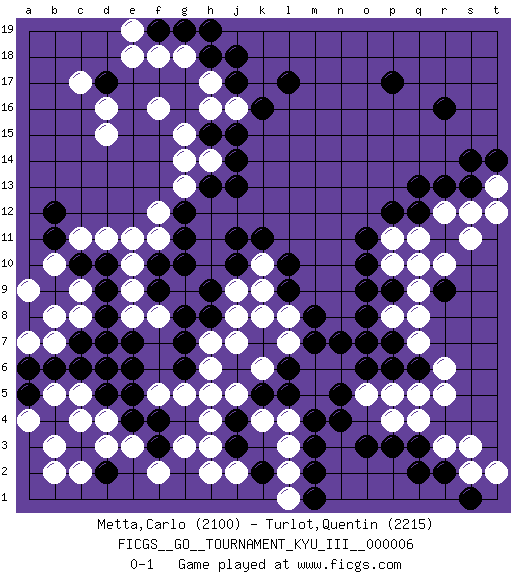 Last move : 0-1 2010 February 10 14:28:50 [Event "FICGS__GO__TOURNAMENT_KYU_III__000006"] [Site "FICGS"] [Date "2009.12.28"] [Round "1"] [Black "Metta,Carlo"] [White "Turlot,Quentin"] [Result "0-1"] [Rating 1 "2100"] [Rating 2 "2215"] 1.r16 d15 2.q3 d3 3.p17 l4 4.r9 p5 5.o3 r5 6.n4 m5 7.n5 n6 8.o6 o5 9.n7 m6 10.m3 o7 11.p6 q7 12.q6 r6 13.p7 p8 14.o8 q5 15.o7 q8 16.o10 p10 17.o11 q10 18.j4 l3 19.m7 g3 20.k7 h4 21.j3 j5 22.k2 l2 23.k5 k4 24.j6 h5 25.l5 h2 26.m2 l1 27.m4 j2 28.m1 h3 29.q12 r12 30.r11 q11 31.r13 s12 32.q13 r10 33.s13 s11 34.k16 h17 35.h15 f16 36.d17 c17 37.j17 h16 38.j15 d16 39.j11 g13 40.c6 c8 41.c3 c2 42.d2 b2 43.d8 c9 44.e6 f8 45.g6 d7 46.e7 e8 47.g11 f11 48.f10 e11 49.j13 h6 50.g7 j7 51.g8 k8 52.l6 k6 53.h9 l7 54.l10 d4 55.d6 s3 56.d10 e10 57.d9 c11 58.c10 b10 59.c7 d11 60.r2 b5 61.b6 s2 62.h18 g18 63.j18 t13 64.t14 t12 65.s14 k10 66.k11 g15 67.g19 f18 68.f19 e19 69.h19 e18 70.b4 c5 71.b9 b8 72.b11 a9 73.b12 a7 74.a6 b7 75.g12 f12 76.h13 g14 77.a5 b3 78.l9 l8 79.m8 j9 80.f4 f5 81.d5 c4 82.e4 e3 83.s1 r3 84.q2 g5 85.e5 a4 86.f3 f2 87.j10 k9 88.f9 e9 89.d7 j16 90.l17 p11 91.p12 h14 92.j14 p4 93.p3 q4 94.p9 q9 95.o9 t2 96.h8 j8 97.g10 h7 98.pass pass 99.pass pass 0-1 Here are the names of the openings (joseki) played in the four corners : Corner q4 : q3 l4 Komoku (Somok, Xiao~mu`) 3-4 Point. The komoku (3-4) point is the traditional corner enclosure move.. Corner d4 : d3 j4 Komoku (Somok, Xiao~mu`) 3-4 Point. The komoku (3-4) point is the traditional corner enclosure move.. Player White won this Go (weiqi, baduk) game. Follow this game move after move (download)You can hide nothing on the goban. (Pierre Audouard) Life is like a ten-speed bicycle: most of us have gears we never use. (Charles M. Schulz)