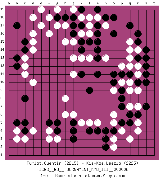 Last move : 1-0 2010 April 10 3:30:4 [Event "FICGS__GO__TOURNAMENT_KYU_III__000006"] [Site "FICGS"] [Date "2009.12.28"] [Round "1"] [Black "Turlot,Quentin"] [White "Kis-Kos,Laszlo"] [Result "1-0"] [Rating 1 "2215"] [Rating 2 "2225"] 1.q5 d16 2.q17 d4 3.q11 q3 4.o4 r5 5.r6 r4 6.q6 o2 7.j16 q15 8.r15 r14 9.r16 p12 10.r13 q14 11.s14 r12 12.s12 q13 13.s13 r11 14.r10 q10 15.s11 q12 16.p11 q9 17.o11 o9 18.m11 n13 19.o16 l13 20.k11 j13 21.l9 r9 22.s10 o6 23.p8 p4 24.p5 o5 25.p9 p10 26.o10 q7 27.p7 r7 28.s7 d10 29.n4 m5 30.m4 l5 31.l4 k5 32.j3 g3 33.j4 h6 34.g4 f4 35.g5 h8 36.j5 j6 37.n2 o3 38.n3 l16 39.f17 d18 40.c14 d14 41.c15 d15 42.b17 h17 43.j17 f18 44.g18 g17 45.h18 h15 46.k14 k13 47.m15 k18 48.j18 j15 49.k15 k16 50.m14 m18 51.e18 e17 52.f19 f16 53.n18 n17 54.o18 f18 55.m16 e19 56.k19 l18 57.m17 g19 58.m19 j19 59.k17 c13 60.b13 c12 61.b12 c11 62.m13 l17 63.l15 j11 64.f5 f3 65.b5 b4 66.c4 c3 67.c5 b3 68.c8 1-0 Here are the names of the openings (joseki) played in the four corners : Corner q4 : q5 q3 Takamoku (Gomok, Gaomu`) 5-4 Point. The takamoku (high) point (5-4). With its emphasis on influence, the 5-4 point complements the 4-4 (hoshi) point in creating an influence-oriented fuseki. Komoku. Black responds with 3-3, 3-5, 4-6, 4-7, 3-6, 3-7. Corner d16 : d16 j16 Hoshi (Hwajeom, Seongjeom, Xingwei`) 4-4 Point. The star or hoshi (4-4) point, emphasizing influence at the potential expense of territory. Corner d4 : d4 j3 Hoshi (Hwajeom, Seongjeom, Xingwei`) 4-4 Point. The star or hoshi (4-4) point, emphasizing influence at the potential expense of territory. Player Black won this Go (weiqi, baduk) game. Follow this game move after move (download)Those who are good at winning, don't usually fight. (Zhang) There are two types of people in this world, good and bad. The good sleep better, but the bad seem to enjoy the waking hours much more. (Woody Allen)