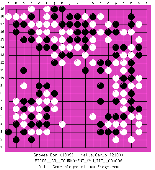 Last move : 0-1 2010 February 10 6:2:1 [Event "FICGS__GO__TOURNAMENT_KYU_III__000006"] [Site "FICGS"] [Date "2009.12.28"] [Round "1"] [Black "Groves,Don"] [White "Metta,Carlo"] [Result "0-1"] [Rating 1 "1909"] [Rating 2 "2100"] 1.p16 r5 2.c15 c4 3.e4 h4 4.d7 e5 5.f5 e6 6.d4 c5 7.c3 b3 8.d5 d6 9.c6 b6 10.c7 e7 11.e8 g6 12.f6 f7 13.b2 d3 14.b4 b5 15.a3 e3 16.f4 f3 17.d2 b7 18.c11 f8 19.e9 e16 20.f9 c16 21.d15 f17 22.d16 d17 23.c17 c18 24.b17 b18 25.d18 e17 26.r7 p4 27.r10 r16 28.r17 s17 29.r18 q16 30.p17 r13 31.q14 q13 32.p14 r14 33.p13 q11 34.r11 p12 35.r12 q12 36.o12 o11 37.n12 p9 38.q10 p10 39.p7 q8 40.r8 q7 41.n7 s9 42.r6 q6 43.q5 s5 44.p5 q4 45.r4 r9 46.s6 s4 47.r3 s3 48.q9 p8 49.g8 g7 50.o5 r2 51.s13 s10 52.b16 o4 53.h17 a18 54.n4 e15 55.o3 p2 56.p3 q3 57.e14 c9 58.f15 h18 59.g18 g17 60.j18 h16 61.j17 g15 62.g14 h14 63.j15 h15 64.h13 j16 65.k16 j14 66.k15 k14 67.l14 l13 68.l11 m14 69.l15 k12 70.j13 g13 71.f14 h12 72.g12 f18 73.g19 f19 74.h19 d19 75.n3 m12 76.n11 m15 77.s14 s15 78.m16 k17 79.l16 n16 80.l17 l18 81.k18 m17 82.k17 o15 83.n17 o17 84.m18 n18 85.o16 m17 86.g16 f16 87.n17 m5 88.n9 m17 0-1 Here are the names of the openings (joseki) played in the four corners : Corner d4 : c4 e4 Komoku (Somok, Xiao~mu`) 3-4 Point. The komoku (3-4) point is the traditional corner enclosure move.. Ikken Takagakari (Hankan Nop'dakeolch'im, Yi Gaogua`jiao~, 1-Space High Approach). The 5-4 approach move has become more popular in modern times, as modern Go emphasizes speed and influence. Corner q4 : r5 r7 Mokuhazushi (Waemok, Wai`mu`) 5-3 Point. The mokuhazushi (5-3) point was popular in the Edo period in Japan (1600 - 1867). It emphasizes influence; territorially, it is inferior to the 3-4 point. Corner q16 : p16 r16 Takamoku (Gomok, Gaomu`) 5-4 Point. The takamoku (high) point (5-4). With its emphasis on influence, the 5-4 point complements the 4-4 (hoshi) point in creating an influence-oriented fuseki. Komoku. Black responds with 3-3, 3-5, 4-6, 4-7, 3-6, 3-7. Player White won this Go (weiqi, baduk) game. Follow this game move after move (download)Grab the border points between two moyos. (Anonymous) They say poker is a zero-sum game. It must be, because every time I play my sum ends up zero. (Max Shapiro)