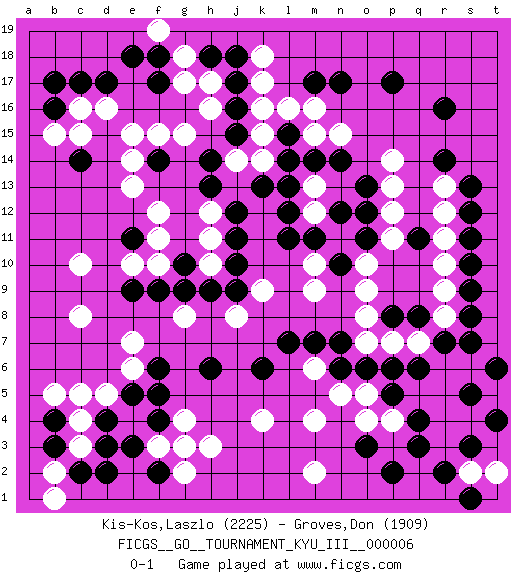 Last move : 0-1 2010 May 14 9:52:9 [Event "FICGS__GO__TOURNAMENT_KYU_III__000006"] [Site "FICGS"] [Date "2009.12.28"] [Round "1"] [Black "Kis-Kos,Laszlo"] [White "Groves,Don"] [Result "0-1"] [Rating 1 "2225"] [Rating 2 "1909"] 1.r16 d16 2.q3 c5 3.p17 q5 4.q8 o5 5.o3 r3 6.r2 r4 7.p2 m4 8.c14 c10 9.f17 e15 10.c17 c16 11.d17 g15 12.b16 b15 13.b17 c15 14.d3 e4 15.d4 d5 16.e5 e6 17.f5 f3 18.b4 b5 19.g3 g2 20.f2 g4 21.f4 h3 22.e3 g3 23.q11 k17 24.f6 e7 25.m17 s2 26.s1 g8 27.f14 c4 28.b3 c3 29.c2 b2 30.d2 f15 31.g10 e14 32.e9 c8 33.e11 k15 34.h6 j8 35.k6 k4 36.l7 m15 37.j10 k9 38.l11 m9 39.n7 o9 40.p6 p7 41.o6 n11 42.l14 q7 43.p5 n5 44.q6 r6 45.p8 o7 46.n6 o8 47.r7 r8 48.s7 s6 49.s8 r9 50.s9 r10 51.s10 r11 52.s11 r12 53.s12 r13 54.s13 p14 55.h13 k14 56.l15 l16 57.m14 n15 58.k13 m12 59.l12 m13 60.l13 m2 61.r14 e13 62.n14 m16 63.o13 p13 64.o12 p12 65.o11 m6 66.m7 f12 67.n10 m10 68.m11 o10 69.n12 p11 70.n17 t2 71.t4 s4 72.t6 p4 73.q4 o4 74.s5 r5 75.s3 h12 76.j12 h11 77.j11 h10 78.h9 f11 79.g9 f10 80.f9 e10 81.j9 b1 82.j16 h16 83.j17 h17 84.j18 g18 85.f18 k18 86.h18 g17 87.j15 f19 88.e18 j14 89.h14 k16 0-1 Here are the names of the openings (joseki) played in the four corners : Corner q4 : q3 q5 Komoku (Somok, Xiao~mu`) 3-4 Point. The komoku (3-4) point is the traditional corner enclosure move.. Ikken Takagakari (Hankan Nop'dakeolch'im, Yi Gaogua`jiao~, 1-Space High Approach). The 5-4 approach move has become more popular in modern times, as modern Go emphasizes speed and influence. Corner d16 : d16 c14 Hoshi (Hwajeom, Seongjeom, Xingwei`) 4-4 Point. The star or hoshi (4-4) point, emphasizing influence at the potential expense of territory. Ikken Kakari (Hankan Keolch'im, Yi Gua`jiao~, 1-Space Low Approach). Black 2 is the standard approach move to the 4-4. Corner d4 : c5 d3 Mokuhazushi (Waemok, Wai`mu`) 5-3 Point. The mokuhazushi (5-3) point was popular in the Edo period in Japan (1600 - 1867). It emphasizes influence; territorially, it is inferior to the 3-4 point. Komoku Kakari. Black 2 is the standard approach because of its solidity and stability. Player White won this Go (weiqi, baduk) game. Follow this game move after move (download)More haste less speed. (John Fairbairn) Information on the Internet is subject to the same rules and regulations as conversation at a bar. (George Lundberg)