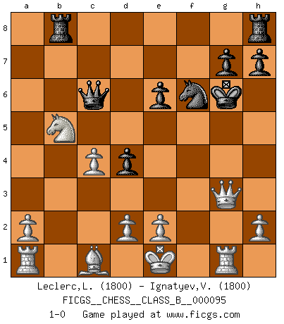 Last move : 1-0 2010 January 13 5:35:14 [Event "FICGS__CHESS__CLASS_B__000095"] [Site "FICGS"] [Date "2009.12.28"] [Round "1"] [White "Leclerc,Luc-Olivier"] [Black "Ignatyev,Vladimir"] [Result "1-0"] [WhiteElo "1800"] [BlackElo "1800"] 1.f4 d5 2.Nf3 c5 3.c4 d4 4.b4 b6 5.g3 Bb7 6.bxc5 bxc5 7.Bg2 f6 8.Na3 Nd7 9.Qa4 Kf7 10.Ng5+ fxg5 11.Bxb7 Rb8 12.Bd5+ e6 13.Bc6 gxf4 14.Bxd7 Nf6 15.Bc6 fxg3 16.Qxa7+ Kg6 17.Rg1 Bd6 18.Nb5 Be5 19.Qxc5 Qc8 20.Qxe5 Qxc6 21.Qxg3+ 1-0 Bird's Opening Player White won this chess game. Follow this game move after move (download)I guess a certain amount of temperament is expected of Chess geniuses. (Ron Gross) Schach verlangt totale Konzentration. (Robert James Fischer) Tu sabes que vas a perder. Aún cuando tenía la ventaja, yo sabía que iba a perder. - al estar jugando con Fischer (Andrew Soltis) Le jeu d'échecs fait naître et fortifie en nous plusieurs qualités précieuses dans le cours de l'existence, telles que la prévoyance, la circonspection, la prudence, et la persévérance. (Benjamin Franklin - 1783, la morale des échecs) Perhaps the current trend of many chess professionals taking up the more lucrative pastime of poker is not a wholly negative one. It may not be too late for humans to relearn how to take risks in order to innovate and thereby maintain the advanced lifestyles we enjoy. And if it takes a poker-playing supercomputer to remind us that we can't enjoy the rewards without taking the risks, so be it. (The Chess Master and the Computer, by Garry Kasparov - 2010)