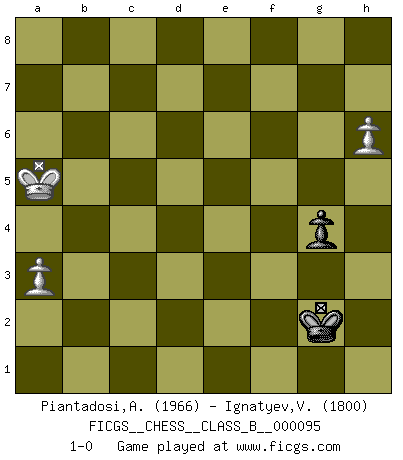 Last move : 1-0 2010 February 12 23:41:34 [Event "FICGS__CHESS__CLASS_B__000095"] [Site "FICGS"] [Date "2009.12.28"] [Round "1"] [White "Piantadosi,Angelo"] [Black "Ignatyev,Vladimir"] [Result "1-0"] [WhiteElo "1966"] [BlackElo "1800"] 1.e4 e5 2.Nf3 d6 3.d4 f5 4.dxe5 fxe4 5.Ng5 d5 6.c4 Be7 7.cxd5 g6 8.Nxe4 Bf5 9.Nbc3 Bb4 10.Bb5+ c6 11.dxc6 bxc6 12.Qxd8+ Kxd8 13.Bg5+ Kc7 14.Bd3 Nd7 15.O-O-O Nxe5 16.Bf4 Re8 17.Rhe1 Kb7 18.Bxe5 Rxe5 19.a3 Bxc3 20.bxc3 Bxe4 21.Bxe4 Rc5 22.Kc2 Nf6 23.Bf3 Nd5 24.Bxd5 cxd5 25.Re5 Rhc8 26.Rd3 Rd8 27.Re7+ Kb6 28.Rxh7 d4 29.Rh6 Rd6 30.Rh4 Rxc3+ 31.Rxc3 dxc3 32.Kxc3 a5 33.f4 Kc5 34.Rh3 Rf6 35.Rf3 Kd5 36.Kd3 Rb6 37.Kc3 Ke4 38.Kc4 Rf6 39.Kb5 Rf5+ 40.Kc4 Rxf4 41.Rxf4+ Kxf4 42.Kb5 g5 43.Kxa5 g4 44.h4 Kg3 45.h5 Kxg2 46.h6 1-0 Philidor : Philidor counter-gambit Queenside Castling by player White (move 15) 10 pieces endgame at move 32 : White KRPPPP , Black KRPP WHITE : King + 1 Rook 4 Pawns BLACK : King + 1 Rook 2 Pawns 9 pieces endgame at move 40 : White KRPPP , Black KRPP WHITE : King + 1 Rook 3 Pawns BLACK : King + 1 Rook 2 Pawns 8 pieces endgame at move 41 : White KRPPP , Black KPP WHITE : King + 1 Rook 3 Pawns BLACK : King + 2 Pawns 7 pieces endgame at move 41 : White KPPP , Black KPP WHITE : King + 3 Pawns BLACK : King + 2 Pawns 6 pieces endgame at move 43 : White KPPP , Black KP WHITE : King + 3 Pawns BLACK : King + 1 Pawn 5 pieces endgame at move 45 : White KPP , Black KP WHITE : King + 2 Pawns BLACK : King + 1 Pawn Player White won this chess game. Follow this game move after move (download)Adequate compensation for a sacrifice is having a sound combination leading to a winning position; adequate compensation for a blunder is having your opponent snatch defeat from the jaws of victory. (Bruce A. Moon) Modernes Schach sorgt sich zuviel um Dinge wie Bauernstruktur usw. Vergessen Sie das, Schachmatt beendet das Spiel! (Nigel Short) Al jugar al Ajedrez entonces, podemos aprender: Primero: Previsión... Segundo: Prudencia... Tercero: Cautela... Y al final, aprendemos del Ajedrez el hábito de no ser desanimados por apariencias malas presentes en el estado de nuestros asuntos, el hábito de la esperanza por una oportunidad favorable y la perseveración de los secretos de los recursos. (Benjamin Franklin) Le joueur d'Echecs qui veut atteindre le top est obligé de développer son propre credo créatif. Alexeï Stepanovicth Souétine. Il est facile d'écrire des livres ! Ce qui est difficile, c'est de jouer ! (Alexeï Stepanovicth Souétine) Knowledge will give you power, but character respect. (Bruce Lee)