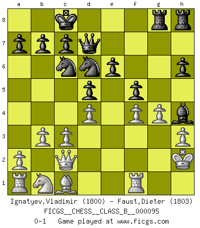 Last move : 0-1 2010 January 17 16:1:57 [Event "FICGS__CHESS__CLASS_B__000095"] [Site "FICGS"] [Date "2009.12.28"] [Round "1"] [White "Ignatyev,Vladimir"] [Black "Faust,Dieter"] [Result "0-1"] [WhiteElo "1800"] [BlackElo "1803"] 1.e4 Nf6 2.e5 Nd5 3.Bc4 Nb6 4.Bb3 d5 5.d4 Nc6 6.c3 Bf5 7.f4 Qd7 8.h3 e6 9.Be3 Nc4 10.Bc1 Be7 11.Nf3 h6 12.O-O O-O-O 13.Bc2 Rdg8 14.g4 Bxc2 15.Qxc2 f5 16.exf6 gxf6 17.b3 Nd6 18.Nh4 f5 19.Kh2 Bxh4 0-1 Alekhine's defense Kingside Castling by player White (move 12) Queenside Castling by player Black (move 12) Player Black won this chess game. Follow this game move after move (download)Bobby is the finest Chess player this country ever produced. His memory for the moves, his brilliance in dreaming up combinations, and his fierce determination to win are uncanny. (John Collins) Schon mancher Spieler hat aufgegeben, um zu vermeiden, daß er eine Figur verliert. (Savielly Grigorievitsch Tartakower) En el Ajedrez, tal como en la vida, las bendiciones de hoy pueden ser el veneno del mañana. (Assaic) Plusieurs personnes se sont demandées comment Tal faisait pour gagner... En fait, c'est très simple ! Il met ses pièces au centre de l'échiquier et les sacrifie quelque part ! (David Bronstein) To err is human, to shift the blame on someone else is tactical. (Mladen Jankovic)