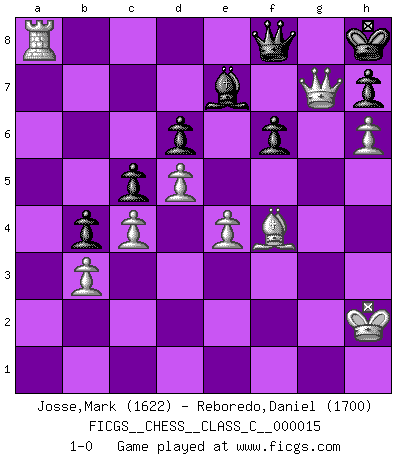 Last move : 1-0 2007 June 3 19:18:25 [Event "FICGS__CHESS__CLASS_C__000015"] [Site "FICGS"] [Date "2006.10.12"] [Round "1"] [White "Josse,Mark"] [Black "Reboredo,Daniel"] [Result "1-0"] [WhiteElo "1622"] [BlackElo "1700"] 1.e4 e5 2.Nf3 Nc6 3.Bc4 Nf6 4.d3 Bc5 5.c3 d6 6.O-O a6 7.Bb3 Ba7 8.h3 Be6 9.Re1 Qe7 10.Nbd2 O-O 11.Nf1 Ne8 12.Ng3 g6 13.Bg5 f6 14.Bh6 Rf7 15.d4 Na5 16.Bxe6 Qxe6 17.Qa4 b6 18.b3 Qd7 19.Qa3 c5 20.Red1 Qb7 21.d5 Bb8 22.Qc1 b5 23.h4 Qd7 24.h5 Nb7 25.a4 Ra7 26.axb5 axb5 27.Qe3 Nd8 28.Qd2 Qc8 29.Qe2 Rfb7 30.Nh4 g5 31.Nhf5 Qd7 32.Nf1 Nf7 33.N1e3 Bc7 34.Qf3 Bd8 35.Ng4 Rb6 36.Rxa7 Qxa7 37.Qe2 b4 38.c4 Ra6 39.Qf3 Qd7 40.Kh2 Ra3 41.Qe3 Kh8 42.g3 Ra2 43.Rd2 Ra3 44.f4 exf4 45.gxf4 gxf4 46.Bxf4 Qa7 47.Ngh6 Nxh6 48.Nxh6 Ng7 49.Rg2 Qd7 50.Qg3 Bc7 51.Nf5 Ra2 52.Rxa2 Nxf5 53.Ra8+ Bd8 54.Qg4 Qe8 55.h6 Qf8 56.Qxf5 Kg8 57.Qe6+ Kh8 58.Qg4 Be7 59.Qg7+ 1-0 Two knights defense (Modern Bishop's Opening) Kingside Castling by player White (move 6) Kingside Castling by player Black (move 10) Player White won this chess game. Follow this game move after move (download)If cunning alone were needed to excel, women would be the best Chess players. (Albin) Ich weiss nicht was Gott gegen mich auf 1.e4 antworten würde. (Robert James Fischer) Bobby es el jugador de Ajedrez mas fino que este país jamás haya producido. Su memoria para las movidas, su brillantez en soñar combinaciones y su feróz determinación por la victoria son algo extraño. (John Collins) Avant la finale, les dieux ont créé le milieu de partie. (Tarrasch) Train yourself to let go of everything you fear to lose. (Master Yoda in Star Wars ep.3)