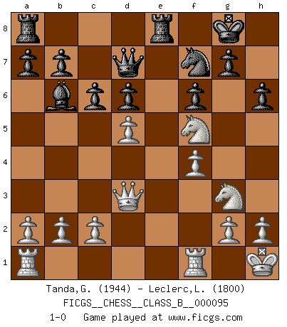 Last move : 1-0 2010 January 20 18:5:55 [Event "FICGS__CHESS__CLASS_B__000095"] [Site "FICGS"] [Date "2009.12.28"] [Round "1"] [White "Tanda,Giovanni"] [Black "Leclerc,Luc-Olivier"] [Result "1-0"] [WhiteElo "1944"] [BlackElo "1800"] 1.d4 f5 2.e4 fxe4 3.Nc3 Nf6 4.Bg5 Nc6 5.d5 Ne5 6.Qd4 d6 7.Nxe4 h6 8.Bxf6 exf6 9.f4 Nf7 10.Bb5+ Bd7 11.Bxd7+ Qxd7 12.Nf3 Be7 13.O-O O-O 14.Ng3 c6 15.Nh4 Bd8 16.Kh1 Bb6 17.Qd3 Rfe8 18.Nhf5 1-0 Dutch : Staunton gambit, Staunton's line Kingside Castling by player White (move 13) Kingside Castling by player Black (move 13) Player White won this chess game. Follow this game move after move (download)Castle early and often. (Rob Sillars) Frage: Gibt es etwas was Sie mehr lieben als Autobahnen ohne Tempobegrenzungen? - Antwort: Deutsche Frauen ohne Tempobegrenzungen. (Loek van Wely) Jugadores de primera clase pierden en contra de jugadores de segunda clase porque los jugadores de segunda clase a veces juegan una partida de primer clase. (Siegbert Tarrasch) C'est la seule position que je connaisse où les deux camps sont mals. Propos prêtés à V. Anand. Empty your mind, be formless, shapeless — like water. (Bruce Lee)