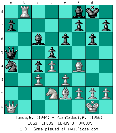 Last move : 1-0 2010 February 1 2:32:48 [Event "FICGS__CHESS__CLASS_B__000095"] [Site "FICGS"] [Date "2009.12.28"] [Round "1"] [White "Tanda,Giovanni"] [Black "Piantadosi,Angelo"] [Result "1-0"] [WhiteElo "1944"] [BlackElo "1966"] 1.d4 Nf6 2.Nf3 g6 3.Bg5 Bg7 4.Nbd2 d5 5.e3 O-O 6.c3 b6 7.Be2 Bb7 8.O-O Nbd7 9.b4 c5 10.bxc5 bxc5 11.Qa4 Qc7 12.Rab1 c4 13.Qb4 Nb6 14.Bf4 Qd8 15.Ne5 Nfd7 16.Nxd7 Qxd7 17.a4 Bc6 18.a5 Na4 19.Qa3 Rfb8 20.Rxb8+ Rxb8 21.Bxb8 Bf8 22.Rb1 e6 23.Qa1 Qd8 24.Bf4 Qxa5 25.Rb8 1-0 King's Indian : Torre attack Kingside Castling by player Black (move 5) Kingside Castling by player White (move 8) Player White won this chess game. Follow this game move after move (download)Why must I lose to this idiot ? (Aron Nimzovich) Später, ... hatte ich zunehmend Erfolg in entscheidenden Partien. Vielleicht weil ich eine einfache Wahrheit erkannte: nicht nur ich hatte Angst, auch mein Gegner. (Mikhail Nekhemyevich Tal) El Ajedrez se juega con la mente... ¡no con las manos!. (Renaud y Kahn) Il n'y a plus de joueurs du niveau de Jacob Murray dont la seule quête est le beau jeu, le plaisir de voir les pièces construire quelque chose. Sur 10 idées à la minute, 9 seront sans intérêt, la dernière s'avèrera géniale. (Christian Bauer) Nobody is always a winner, and anybody who says he is, is either a liar or doesn't play poker. (Amarillo Slim)