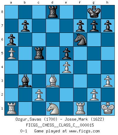 Last move : 0-1 2007 February 26 17:55:41 [Event "FICGS__CHESS__CLASS_C__000015"] [Site "FICGS"] [Date "2006.10.12"] [Round "1"] [White "Ozgur,Savas"] [Black "Josse,Mark"] [Result "0-1"] [WhiteElo "1700"] [BlackElo "1622"] 1.e4 c5 2.Nf3 d6 3.d4 cxd4 4.Nxd4 Nf6 5.Nc3 a6 6.Be3 e6 7.Be2 Be7 8.O-O O-O 9.a4 Nc6 10.Kh1 Qc7 11.f4 Re8 12.Qe1 Nxd4 13.Bxd4 e5 14.fxe5 dxe5 15.Bg1 Be6 16.a5 Rac8 17.Bb6 Qc6 18.Bd3 Nd7 19.Be3 Bc5 20.Qf2 Bxe3 21.Qxe3 Qc5 22.Qf3 Nf6 23.h3 Qb4 24.Nd1 Red8 25.b3 Qc5 26.Qf2 Bxb3 27.Qxc5 Rxc5 0-1 This chess game has been lost on time (started : 2006.10.12 12:37:58) Sicilian : Najdorf, Byrne (English) attack Kingside Castling by player White (move 8) Kingside Castling by player Black (move 8) Player Black won this chess game. Follow this game move after move (download)Alekhine is a poet who creates a work of art out of something that would hardly inspire another man to send home a picture post card. (Max Euwe) Um dein Spiel zu verbessern musst du zuallererst das Endspiel studieren, denn diese kann unabhängig studiert werden. Die Eröffnung und das Mittelspiel müssen immer in Bezug gesetzt werden zum Endspiel. (José Raúl Capablanca) El Ajedrez es imaginación. (David Bronstein) Dieu déplace le joueur, et celui-ci la pièce. Quel Dieu derrière Dieu commence donc la trame ? Arturo Perez-Reverte (prix de littérature policière 1993). He who is a good ruler must first have been ruled. (Aristotle)