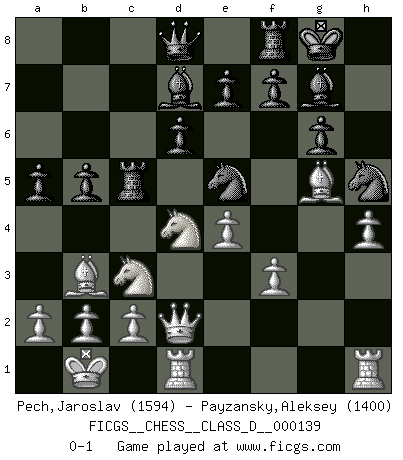 Last move : 0-1 2010 April 13 2:17:23 [Event "FICGS__CHESS__CLASS_D__000139"] [Site "FICGS"] [Date "2009.12.29"] [Round "1"] [White "Pech,Jaroslav"] [Black "Payzansky,Aleksey"] [Result "0-1"] [WhiteElo "1594"] [BlackElo "1400"] 1.e4 c5 2.Nf3 d6 3.d4 cxd4 4.Nxd4 Nf6 5.Nc3 g6 6.Be3 Bg7 7.f3 O-O 8.Qd2 Nc6 9.Bc4 Bd7 10.O-O-O Rc8 11.Bb3 Ne5 12.h4 h5 13.Bg5 Rc5 14.Kb1 b5 15.g4 a5 16.gxh5 Nxh5 0-1 Sicilian : Dragon, Yugoslav attack, 7...O-O Kingside Castling by player Black (move 7) Queenside Castling by player White (move 10) Player Black won this chess game. Follow this game move after move (download)In complicated positions, Bobby Fischer hardly had to be afraid of anybody. (Paul Keres) Viele Opfer benötigen überhaupt keine konkrete Berechnung. Es genügt sich die entstehende Position kurz vorzustellen, um uns davon zu überzeugen, dass das Opfer korrekt ist. (Mikhail Nekhemyevich Tal) De eso se trata el Ajedrez. Un día le das una lección a tu oponente y al día siguiente el te da una a tí. (Bobby Fischer) Les écrivains ont utilisé les échecs pour analyser les côtés extrêmes de la nature humaine. Dans ce cadre, les échecs offrent un champ d'expérimentation idéal. Mais on pourrait faire la même chose avec la peinture. Et là, en vous référant à Van Gogh, vous ne tirerez pas de conclusion définitive sur les peintres. (Gary Kasparov) Your best chance to get a Royal Flush in a casino is in the bathroom. (Anonymous)