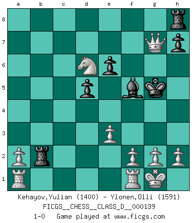 Last move : 1-0 2010 February 2 20:47:39 [Event "FICGS__CHESS__CLASS_D__000139"] [Site "FICGS"] [Date "2009.12.29"] [Round "1"] [White "Kehayov,Yulian"] [Black "Ylonen,Olli"] [Result "1-0"] [WhiteElo "1400"] [BlackElo "1591"] 1.d4 d5 2.Bf4 Bf5 3.e3 Nf6 4.Nf3 Nc6 5.c4 e6 6.c5 b6 7.Bb5 Qd7 8.Ne5 Qd8 9.Bxc6+ Nd7 10.Bxd7+ Ke7 11.Nc6+ Kxd7 12.Nxd8 Rxd8 13.O-O bxc5 14.Nc3 cxd4 15.Qxd4 Bd6 16.Bxd6 Kxd6 17.Qxa7 Rb8 18.Nb5+ Ke7 19.Qxc7+ Kf6 20.Nd6 Rxb2 21.Qxf7+ Kg5 22.Qxg7+ 1-0 Queen's pawn, Mason variation Kingside Castling by player White (move 13) Player White won this chess game. Follow this game move after move (download)That's what Chess is all about. One day you give your opponent a lesson, the next day he gives you one. (Bobby Fischer) Schach ist ein schwarz-weisser Dschungel. (Garry Kasparov) ¿Cual es el objetivo de jugar una apertura de gambito?... Para adquirir una reputación de ser un jugador apuesto a costo de perder el juego. (Siegbert Tarrasch) RxDa4 pat (...) Wisdom begins at the end. (Daniel Webster)