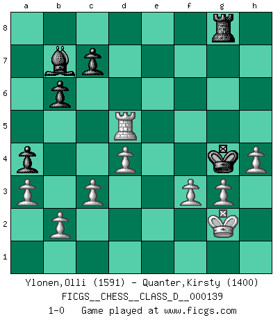 Last move : 1-0 2010 March 16 21:39:27 [Event "FICGS__CHESS__CLASS_D__000139"] [Site "FICGS"] [Date "2009.12.29"] [Round "1"] [White "Ylonen,Olli"] [Black "Quanter,Kirsty"] [Result "1-0"] [WhiteElo "1591"] [BlackElo "1400"] 1.e4 b6 2.d4 Bb7 3.Nc3 e6 4.Nf3 Nf6 5.Bd3 Bb4 6.Bd2 O-O 7.Qe2 a5 8.a3 Bxc3 9.Bxc3 d5 10.Ng5 h6 11.e5 hxg5 12.exf6 Qxf6 13.O-O Qe7 14.Qh5 g6 15.Bxg6 fxg6 16.Qxg6+ Kh8 17.Bd2 Nc6 18.Bxg5 Qg7 19.Qxg7+ Kxg7 20.c3 a4 21.Rfe1 Kg6 22.h4 Nd8 23.Bxd8 Raxd8 24.Rxe6+ Kh5 25.g3 Rde8 26.Rae1 Rxe6 27.Rxe6 Kg4 28.Re7 Rc8 29.Kg2 Ba6 30.Re5 Rg8 31.Rxd5 Bb7 32.f3+ 1-0 Owen defense Kingside Castling by player Black (move 6) Kingside Castling by player White (move 13) Player White won this chess game. Follow this game move after move (download)I have always a slight feeling of pity for the man who has no knowledge of Chess. (Siegbert Tarrasch) Dass jemand wie Surab Asmaiparaschwili, der selbst Elopunkte gekauft hat , Vize-Präsident der Fide werden konnte, sagt schon einges über den Zustand dieser Organisation aus. (Joel Lautier) Vive, pierde y aprende al observar a tu oponente como gana. (Amber Steenbock) L'ordinateur a tué l'originalité. Il n'y a plus guère d'aventures sur l'échiquier. (Jacob Murray) The general who wins the battle makes many calculations in his temple before the battle is fought. The general who loses makes but few calculations beforehand. (Sun Tzu)