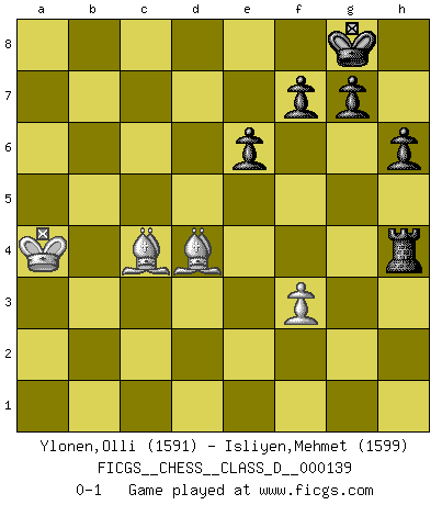 Last move : 0-1 2010 March 26 1:3:59 [Event "FICGS__CHESS__CLASS_D__000139"] [Site "FICGS"] [Date "2009.12.29"] [Round "1"] [White "Ylonen,Olli"] [Black "Isliyen,Mehmet"] [Result "0-1"] [WhiteElo "1591"] [BlackElo "1599"] 1.e4 c5 2.Nf3 Nc6 3.Nc3 Nf6 4.d3 d5 5.Bf4 e6 6.d4 dxe4 7.Nd2 cxd4 8.Ne2 Bb4 9.c3 dxc3 10.Nxc3 Bxc3 11.bxc3 O-O 12.f3 exf3 13.Nxf3 Qa5 14.Qd2 Ne4 15.Qd3 Qxc3+ 16.Qxc3 Nxc3 17.Bc4 Nb4 18.a4 Nc2+ 19.Kd2 Nxa1 20.Kxc3 b6 21.Rxa1 Bd7 22.Kb3 Rac8 23.Rd1 Bc6 24.Nh4 h6 25.Nf3 Bxf3 26.gxf3 Rfd8 27.Rxd8+ Rxd8 28.Kb4 Rd4 29.Be3 Rh4 30.a5 bxa5+ 31.Kb5 a4 32.Bf2 Rxh2 33.Bxa7 Rh1 34.Bc5 Ra1 35.Bd4 Rh1 36.Kxa4 Rh4 0-1 Sicilian defense Kingside Castling by player Black (move 11) 10 pieces endgame at move 36 : White KBBP , Black KRPPPP WHITE : King + 2 Bishops 1 Pawn BLACK : King + 1 Rook 4 Pawns Player Black won this chess game. Follow this game move after move (download)Chess is in its essence a game, in its form an art, and in its execution a science. (Baron Tassilo) Schach wird sich dank seiner hohen kulturellen Tradition immer durchsetzen. In näherer Zukunft womöglich sogar als Gegenreaktion auf die maßlose Reizüberflutung im Freizeit- und Spielbereich. (Garry Kasparov) El Ajedrez es como la guerra en un tablero. (Bobby Fischer) 'L'échange des dames est un coup dur pour les deux adversaires...' Un journaliste lors d'une partie du match Spassky-Fischer It's only after you lost everything, Tyler says, that you're free to do anything. (Chuck Palahniuk, Fight Club)