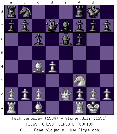 Last move : 0-1 2010 March 17 21:16:46 [Event "FICGS__CHESS__CLASS_D__000139"] [Site "FICGS"] [Date "2009.12.29"] [Round "1"] [White "Pech,Jaroslav"] [Black "Ylonen,Olli"] [Result "0-1"] [WhiteElo "1594"] [BlackElo "1591"] 1.e4 c6 2.d4 d5 3.Nc3 dxe4 4.Nxe4 Nf6 5.Nxf6+ exf6 6.Bc4 Be6 7.Qe2 Qd7 8.Nf3 Be7 9.O-O O-O 0-1 This chess game has been lost on time (started : 2009.12.29 3:40:8) Caro-Kann : Forgacs variation Kingside Castling by player White (move 9) Kingside Castling by player Black (move 9) Player Black won this chess game. Follow this game move after move (download)Chess is like life. (Boris Spassky) Schach ist ein Teil der Kultur, und wenn es mit der Kultur abwärts geht, geht es auch mit dem Schach abwärts. (Mikhail Moiseyevich Botvinik) El Ajedrez moderno está demasiado preocupado con cosas como la estructura de Peones. Olvidenlo, el Jaque Mate termina la partida. (Nigel Short) Les échecs, c'est l'art d'analyser. (Mikhail Botvinnik) The leaves of memory seemed to make a mournful rustling in the dark. (Henry Wadsworth Longfellow)