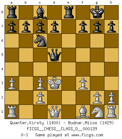 Last move : 0-1 2010 January 17 12:37:22 [Event "FICGS__CHESS__CLASS_D__000139"] [Site "FICGS"] [Date "2009.12.29"] [Round "1"] [White "Quanter,Kirsty"] [Black "Budnar,Milos"] [Result "0-1"] [WhiteElo "1400"] [BlackElo "1429"] 1.e4 e5 2.d4 exd4 3.Qxd4 Nc6 4.Qd1 Nf6 5.Nc3 Bb4 6.Bd2 O-O 7.a3 Bxc3 8.Bxc3 Nxe4 9.f3 Qh4+ 10.Ke2 Nxc3+ 11.bxc3 Re8+ 12.Kd2 Qg5+ 13.Kd3 Qd5+ 0-1 Centre game Kingside Castling by player Black (move 6) Player Black won this chess game. Follow this game move after move (download)On the chessboard, lies and hypocrisy do not survive long. (Emanuel Lasker) Stelle das Brett so, daß die Sonne in die Augen deines Gegners scheint. (Ruy López) Yo siempre he tenido un ligero sentimiento de lástima por una persona que no tiene conocimiento del Ajedrez. (Siegbert Tarrasch) Toute estimation doit être constamment réévaluée. (Jacob Estrin) If things go wrong, don't go with them. (Roger Babson)