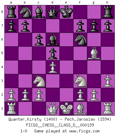 Last move : 1-0 2010 April 13 2:17:41 [Event "FICGS__CHESS__CLASS_D__000139"] [Site "FICGS"] [Date "2009.12.29"] [Round "1"] [White "Quanter,Kirsty"] [Black "Pech,Jaroslav"] [Result "1-0"] [WhiteElo "1400"] [BlackElo "1594"] 1.e4 e6 2.d4 d5 3.exd5 exd5 4.Nc3 Nf6 5.Nf3 Bd6 6.Bg5 c6 7.h3 1-0 French : Exchange variation Player White won this chess game. Follow this game move after move (download)The way he plays Chess demonstrates a man's whole nature. (Stanley Ellin) Offener Brief an US-Präsident Bush anlässlich der Verhaftung Bobby Fishers: Verhaften Sie mich. Stecken Sie mich in dieselbe Zelle wie Bobby Fisher und geben Sie uns ein Schachspiel mit. (Boris Vassilievich Spassky) Yo adoro todas la posiciones. Denme una partida posicional difícil, y la jugaré. Pero posiciones totalmente ganadas, no las tolero. (Hein Donner) Comme les marins qui ont mille raisons différentes d'aller en mer, les joueurs d'échecs en ont tout autant avant de s'installer devant une table et jouer... (Vincent Bertignac, philosophe) To send light into the darkness of men's hearts - such is the duty of the artist. (Schumann)
