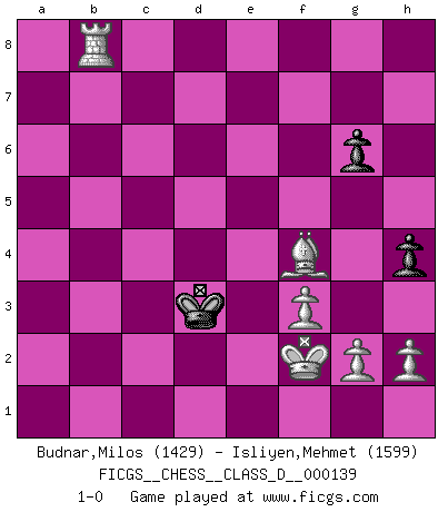 Last move : 1-0 2010 March 12 21:16:9 [Event "FICGS__CHESS__CLASS_D__000139"] [Site "FICGS"] [Date "2009.12.29"] [Round "1"] [White "Budnar,Milos"] [Black "Isliyen,Mehmet"] [Result "1-0"] [WhiteElo "1429"] [BlackElo "1599"] 1.e4 e5 2.Nf3 Nc6 3.Bb5 Nd4 4.Nxd4 exd4 5.O-O c6 6.Ba4 Ne7 7.d3 b5 8.Bb3 g6 9.c3 dxc3 10.Nxc3 Bg7 11.Bg5 f6 12.Be3 a5 13.a4 Ba6 14.axb5 cxb5 15.Bd5 Nxd5 16.Nxd5 O-O 17.Nb6 Rb8 18.Rxa5 f5 19.Rxa6 fxe4 20.Qb3+ Kh8 21.dxe4 Be5 22.Qxb5 Rf6 23.Qxe5 Kg8 24.Qd5+ Kg7 25.Ra8 Rfxb6 26.Rxb8 Rxb8 27.Bd4+ Kh6 28.Be3+ Kg7 29.Qe5+ Kf7 30.Bg5 Qe8 31.Qxe8 Rxe8 32.f3 Rb8 33.Rb1 Ke6 34.b4 Ke5 35.Be3 d5 36.exd5 Kxd5 37.b5 Kc4 38.b6 Kd3 39.Kf2 h5 40.b7 h4 41.Bf4 Re8 42.b8=Q Rxb8 43.Rxb8 1-0 Ruy Lopez : Bird's defense Kingside Castling by player White (move 5) Kingside Castling by player Black (move 16) Promotion Queen by player White (move 42) 10 pieces endgame at move 42 : White KRBPPP , Black KRPP WHITE : King + 1 Rook 1 Bishop 3 Pawns BLACK : King + 1 Rook 2 Pawns 9 pieces endgame at move 43 : White KRBPPP , Black KPP WHITE : King + 1 Rook 1 Bishop 3 Pawns BLACK : King + 2 Pawns Player White won this chess game. Follow this game move after move (download)Look at Garry Kasparov. After he loses, invariably he wins the next game. He just kills the next guy. That's something that we have to learn to be able to do. (Maurice Ashley) Ich könnte leicht behaupten: Ja,ja, Leonid Breschnew wollte nicht, daß ich Weltmeister werde. In der Tat war die Sache komplizierter. (Viktor Kortschnoi) Debemos de asegurarnos de que el Ajedrez no se convierta en un lenguaje muerto, muy interesante, pero tan solo para un grupo muy pequeño. (Sytze Faber) Si le désir cupide (et stupide) de gagner est une inépuisable source de souffrance, une combinaison brillante sur l'échiquier est une découverte : le coquelicot qui s'épanouit lorsque apparaît la Voie Lactée. (Arrabal) There is a very easy way to return from a casino with a small fortune : go there with a large one. (Jack Yelton)