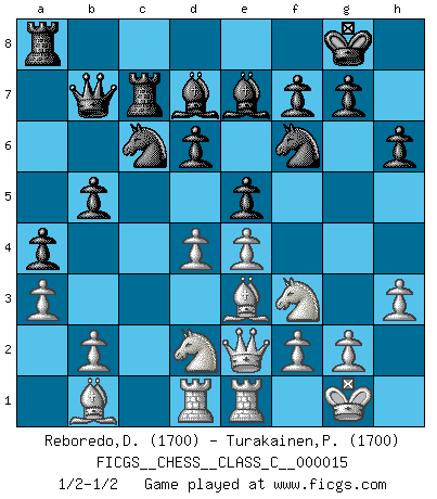 Last move : 1/2-1/2 2006 December 13 0:41:16 [Event "FICGS__CHESS__CLASS_C__000015"] [Site "FICGS"] [Date "2006.10.12"] [Round "1"] [White "Reboredo,Daniel"] [Black "Turakainen,Pekka I."] [Result "1/2-1/2"] [WhiteElo "1700"] [BlackElo "1700"] 1.e4 e5 2.Nf3 Nc6 3.Bb5 a6 4.Ba4 Nf6 5.O-O Be7 6.Re1 b5 7.Bb3 d6 8.c3 O-O 9.h3 Na5 10.Bc2 c5 11.d4 Qc7 12.Nbd2 cxd4 13.cxd4 Nc6 14.Nb3 a5 15.Be3 a4 16.Nbd2 Bd7 17.Rc1 Qb7 18.Qe2 Rfc8 19.Bb1 h6 20.a3 Rc7 21.Rcd1 1/2-1/2 Ruy Lopez : Closed Kingside Castling by player White (move 5) Kingside Castling by player Black (move 8) This chess game ended in a draw. Follow this game move after move (download)I like to say that Bobby Fischer was the greatest player ever. But what made Fischer a genius was his ability to blend an American freshness and pragmatism with Russian ideas about strategy. (Bruce Pandolfini) Jeder Schachmeister war einmal ein Anfänger. (Irving Chernev) Cuando la partida de Ajedrez termina, el Peón y el Rey regresan a la misma caja. (Irish saying) La solitude du joueur d'Echecs à l'approche du mat est semblable à celle du condamné. (Francis Szpiner) Either move or be moved. (Ezra Pound)