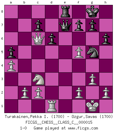 Last move : 1-0 2007 March 7 0:45:53 [Event "FICGS__CHESS__CLASS_C__000015"] [Site "FICGS"] [Date "2006.10.12"] [Round "1"] [White "Turakainen,Pekka I."] [Black "Ozgur,Savas"] [Result "1-0"] [WhiteElo "1700"] [BlackElo "1700"] 1.e4 e5 2.Nf3 Nc6 3.d4 exd4 4.Nxd4 d6 5.Nc3 Be7 6.Bb5 Bd7 7.O-O Nf6 8.Re1 O-O 9.Bxc6 bxc6 10.Qf3 Qc8 11.Bg5 h6 12.Bh4 Re8 13.Nf5 Bxf5 14.exf5 Qd7 15.Re2 Nh7 16.Bxe7 Rxe7 17.Rxe7 Qxe7 18.Qxc6 Re8 19.g3 Ng5 20.a4 a5 21.Rd1 1-0 Scotch game Kingside Castling by player White (move 7) Kingside Castling by player Black (move 8) Player White won this chess game. Follow this game move after move (download)I still hope to kill Fischer. (Boris Spassky) Der Umstand, daß uns eine 7 Stunden Zeitkontrolle ermöglicht eine großartige, tiefe Partie zu spielen, ist für die Massenmedien nicht weiter von Bedeutung. (Alexej Shirov) El Ajedrez es el arte del análisis. (Mikhail Botvinnik) Ce qui est bien, c'est d'avoir tout un tas de pièces en prise : l'adversaire ne peut en prendre qu'une à la fois. Cité par Thierry Audin. Don't anthropomorphize computers - they hate it. (Anonymous)