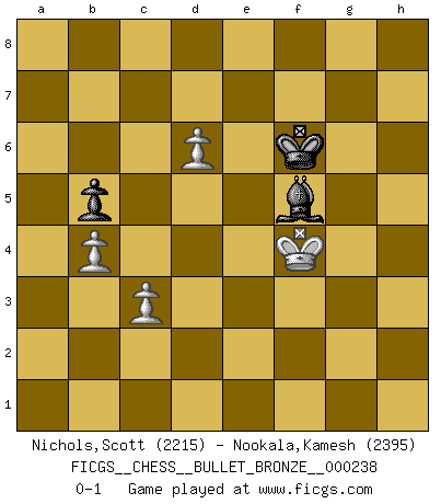 Last move : 0-1 2010 April 19 16:48:34 [Event "FICGS__CHESS__BULLET_BRONZE__000238"] [Site "FICGS"] [Date "2010.04.19"] [Round "1"] [White "Nichols,Scott"] [Black "Nookala,Kamesh"] [Result "0-1"] [WhiteElo "2215"] [BlackElo "2395"] 1.e4 c5 2.Nf3 d6 3.d4 cxd4 4.Nxd4 Nf6 5.Nc3 a6 6.Be3 e5 7.Nf3 Be7 8.Bc4 O-O 9.O-O Nc6 10.Re1 b5 11.Bf1 Rb8 12.Bg5 Ng4 13.Bc1 Nf6 14.Nd5 Nxd5 15.exd5 Na5 16.b3 f5 17.h3 Bd7 18.Bb2 Qb6 19.Rc1 Bf6 20.Qd2 h6 21.Ba1 Nb7 22.b4 a5 23.a3 Ra8 24.Bb2 axb4 25.axb4 Ra2 26.Bc3 Rfa8 27.Ra1 Nd8 28.h4 Nf7 29.Rxa2 Rxa2 30.Ra1 Rxa1 31.Bxa1 f4 32.h5 Kf8 33.c3 Ng5 34.Nxg5 hxg5 35.Bd3 g4 36.Kf1 Be8 37.g3 Qb7 38.Bf5 fxg3 39.fxg3 Bxh5 40.Be4 Qf7 41.Qc2 Kg8 42.Bh7+ Kh8 43.Be4 Bh4 44.Kg2 Bd8 45.Qf2 Qf6 46.Kf1 Bb6 47.Qxf6 gxf6 48.Bd3 Be8 49.Bb2 Kg7 50.Ba3 Bd7 51.Bc1 Kf7 52.Bh6 f5 53.Bg5 Kg6 54.Be7 Bc7 55.Kf2 Kh5 56.Ke3 f4+ 57.gxf4 Bb6+ 58.Ke2 exf4 59.Bxd6 f3+ 60.Kf1 Kh4 61.Be4 Kg5 62.Bc5 Bc7 63.Kg1 Be5 64.Be3+ Bf4 65.Kf2 Bf5 66.Bxf3 Bxe3+ 67.Kxe3 gxf3 68.Kxf3 Kf6 69.Kf4 Bh7 70.d6 Bf5 0-1 Sicilian : Najdorf, Byrne (English) attack Kingside Castling by player Black (move 8) Kingside Castling by player White (move 9) 10 pieces endgame at move 66 : White KBPPP , Black KBBPP WHITE : King + 1 Bishop 3 Pawns BLACK : King + 2 Bishops 2 Pawns 9 pieces endgame at move 67 : White KBPPP , Black KBPP WHITE : King + 1 Bishop 3 Pawns BLACK : King + 1 Bishop 2 Pawns 8 pieces endgame at move 67 : White KPPP , Black KBPP WHITE : King + 3 Pawns BLACK : King + 1 Bishop 2 Pawns 7 pieces endgame at move 68 : White KPPP , Black KBP WHITE : King + 3 Pawns BLACK : King + 1 Bishop 1 Pawn Player Black won this chess game. Follow this game move after move (download)Adequate compensation for a sacrifice is having a sound combination leading to a winning position; adequate compensation for a blunder is having your opponent snatch defeat from the jaws of victory. (Bruce A. Moon) Ich kenne keine einzige Person, die behaupten würde, Garri Kasparow sei ein guter Mensch (Nigel Short) Un jugador que es sorprendido, esta derrotado a medias. (Proverbio) Vous n'êtes pas toujours obligé de jouer le meilleur coup. Un coup doit être actif, entreprenant, correct et beau ! (David Bronstein) Either move or be moved. (Ezra Pound)