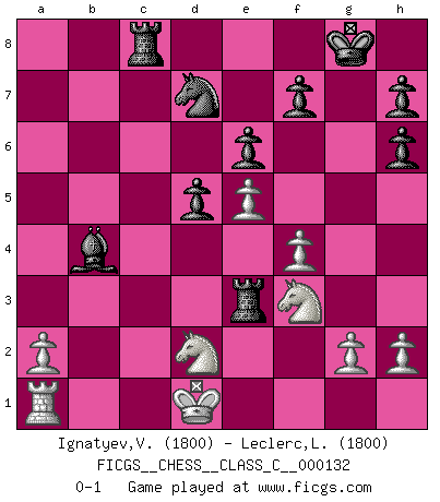 Last move : 0-1 2010 January 21 7:45:7 [Event "FICGS__CHESS__CLASS_C__000132"] [Site "FICGS"] [Date "2009.12.30"] [Round "1"] [White "Ignatyev,Vladimir"] [Black "Leclerc,Luc-Olivier"] [Result "0-1"] [WhiteElo "1800"] [BlackElo "1800"] 1.e4 c6 2.d4 d5 3.e5 c5 4.dxc5 e6 5.Be3 Nh6 6.Bxh6 gxh6 7.b4 a5 8.c3 axb4 9.cxb4 b6 10.Bb5+ Bd7 11.Bxd7+ Nxd7 12.f4 bxc5 13.bxc5 Bxc5 14.Nd2 Qa5 15.Ngf3 O-O 16.Qc2 Rfc8 17.Qd3 Qb4 18.Ke2 Ra3 19.Rhb1 Rxd3 20.Rxb4 Re3+ 21.Kd1 Bxb4 0-1 Caro-Kann : Advance variation Kingside Castling by player Black (move 15) Player Black won this chess game. Follow this game move after move (download)Of all my Russian books, the defense contains and diffuses the greatest 'warmth' which may seem odd seeing how supremely abstract Chess is supposed to be. (Vladimir Nabokov) Ein Schachspiel besteht aus drei Phasen: Die erste, wenn du hofftst den Vorteil zu haben, die zweite, wenn du glaubst einen Vorteil zu haben, und die dritte.... wenn du weißt Du wirst verlieren. (Savielly Grigorievitsch Tartakower) El Ajedrez se juega con la mente... ¡no con las manos!. (Renaud y Kahn) Mais n'est-ce pas déjà le limiter injurieusement que d'appeler les échecs un jeu? N'est-ce pas aussi une science, un art, ou quelque chose qui, comme le cercueil de Mahomet entre ciel et terre, est suspendu entre l'un et l'autre, et qui réunit un nombre incroyable de contraires ? (Stefan Zweig) Hardware: the parts of a computer that can be kicked. (Jeff Persis)