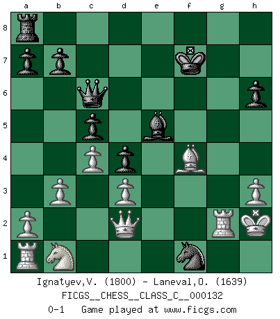Last move : 0-1 2010 January 12 14:55:35 [Event "FICGS__CHESS__CLASS_C__000132"] [Site "FICGS"] [Date "2009.12.30"] [Round "1"] [White "Ignatyev,Vladimir"] [Black "Laneval,Olivier"] [Result "0-1"] [WhiteElo "1800"] [BlackElo "1639"] 1.e4 c5 2.f4 d5 3.e5 Nc6 4.c3 Bf5 5.d3 e6 6.Nf3 Qc7 7.Be2 f6 8.O-O fxe5 9.fxe5 d4 10.c4 Nge7 11.h3 h6 12.Nh4 Nxe5 13.Bh5+ g6 14.Nxf5 exf5 15.Bf3 Nxf3+ 16.Qxf3 Bg7 17.Bf4 Qb6 18.Qe2 Kf7 19.b3 Rhe8 20.Qd2 g5 21.Bg3 f4 22.Bh2 Nf5 23.g3 Ne3 24.Rf2 Qg6 25.gxf4 gxf4 26.Kh1 Qc6+ 27.Kg1 Be5 28.Bxf4 Rg8+ 29.Kh2 Rg2+ 30.Rxg2 Nf1+ 0-1 Sicilian : Grand Prix attack Kingside Castling by player White (move 8) Player Black won this chess game. Follow this game move after move (download)Chess is a terrific way for kids to build self image and self esteem. (Saudin Robovic) Mein Name ist Rustam Kamsky. Sie haben meinen Sohn belästigt. Bereiten Sie sich aufs Sterben vor. (Rustam Kamsky) A la fecha, Fischer esta simplemente un nivel arriba de todos los mejores jugadores de Ajedrez del mundo. (John Jacobs) Demandez au pauvre Cg1 ce qu'il en pense. Eduard Gufeld à propos de la variante Saemisch de l'Est-Indienne. Live, lose, and learn, by observing your opponent how to win. (Amber Steenbock)