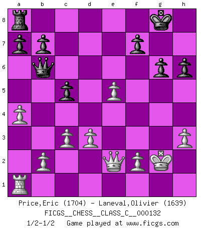 Last move : 1/2-1/2 2010 April 4 21:47:10 [Event "FICGS__CHESS__CLASS_C__000132"] [Site "FICGS"] [Date "2009.12.30"] [Round "1"] [White "Price,Eric"] [Black "Laneval,Olivier"] [Result "1/2-1/2"] [WhiteElo "1704"] [BlackElo "1639"] 1.e4 c5 2.Nf3 Qa5 3.c3 Nc6 4.a3 g6 5.g3 Bg7 6.Bg2 d6 7.h3 Nf6 8.d3 e5 9.Nbd2 O-O 10.Nc4 Qd8 11.O-O h6 12.a4 Be6 13.Re1 d5 14.exd5 Bxd5 15.Ncxe5 Nxe5 16.Nxe5 Bxg2 17.Kxg2 Re8 18.Bf4 Nh5 19.Qf3 Nxf4+ 20.gxf4 Bxe5 21.Rxe5 Rxe5 22.fxe5 Qb6 23.Qe2 Qc6+ 24.Qf3 Qb6 25.Qe2 1/2-1/2 Sicilian : Stiletto (Althouse) variation Kingside Castling by player Black (move 9) Kingside Castling by player White (move 11) This chess game ended in a draw. Follow this game move after move (download)You are for me the Queen on d8 and I am the Pawn on d7 !! (Eduard Gufeld) Es ist besser die Steine des Gegners zu opfern. (Savielly Grigorievitsch Tartakower) El Ajedrez es un expediente tonto que hace creer a la gente inactiva que hacen una cosa muy astuta cuando solamente estan perdiendo su tiempo. (George Bernard Shaw) Fischer est le meilleur joueur du monde et Karpov n'est qu'un joueur de bistrot. (Garry Kasparov, agé de 16 ans) Train yourself to let go of everything you fear to lose. (Master Yoda in Star Wars ep.3)