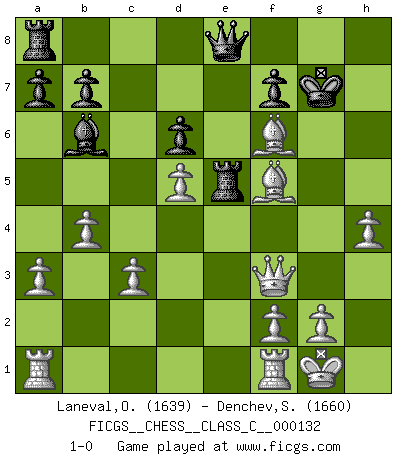 Last move : 1-0 2010 February 9 9:29:44 [Event "FICGS__CHESS__CLASS_C__000132"] [Site "FICGS"] [Date "2009.12.30"] [Round "1"] [White "Laneval,Olivier"] [Black "Denchev,Stanimir"] [Result "1-0"] [WhiteElo "1639"] [BlackElo "1660"] 1.e4 c5 2.Nf3 e6 3.d4 cxd4 4.Nxd4 Nf6 5.Nc3 Bb4 6.Bd3 d6 7.Bd2 Nc6 8.Nf3 O-O 9.a3 Ba5 10.b4 Bb6 11.O-O e5 12.Bg5 h6 13.Bh4 g5 14.Nxg5 hxg5 15.Bxg5 Be6 16.Nd5 Bxd5 17.exd5 Nd4 18.c3 e4 19.Bxe4 Re8 20.Bd3 Re5 21.h4 Nf5 22.Qf3 Kg7 23.Bxf5 Qe8 24.Bxf6+ 1-0 Sicilian : Pin variation (Sicilian counter-attack) Kingside Castling by player Black (move 8) Kingside Castling by player White (move 11) Player White won this chess game. Follow this game move after move (download)I'd rather have a Pawn than a finger. (Reuben Fine) Obwohl ich alt bin, darf mir niemand den Finger in den Mund stecken, sonst beisse ich. (Wilhelm Steinitz) El Ajedrez hace al hombre ser mas sabio y ver mas claro. (Vladimir Putin) J'apprécie les joueurs d'est-indienne, c'est grâce à eux que je nourris ma famille depuis tant d'années. (Petrosian) If you don't practice you don't deserve to win. (Andre Agassi)