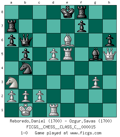 Last move : 1-0 2007 March 10 1:6:11 [Event "FICGS__CHESS__CLASS_C__000015"] [Site "FICGS"] [Date "2006.10.12"] [Round "1"] [White "Reboredo,Daniel"] [Black "Ozgur,Savas"] [Result "1-0"] [WhiteElo "1700"] [BlackElo "1700"] 1.e4 c5 2.Nf3 Nc6 3.d4 cxd4 4.Nxd4 Nf6 5.Nc3 e5 6.Ndb5 d6 7.Bg5 a6 8.Na3 b5 9.Bxf6 gxf6 10.Nd5 f5 11.Bd3 Be6 12.Qh5 f4 13.g3 fxg3 14.hxg3 Be7 15.f4 Bxd5 16.exd5 Nb4 17.Bf5 Qb6 18.O-O-O h6 19.Be6 Rf8 20.Rhe1 Ra7 21.fxe5 Bg5+ 22.Kb1 dxe5 23.Rxe5 1-0 Sicilian : Pelikan (Lasker/Sveshnikov) variation Queenside Castling by player White (move 18) Player White won this chess game. Follow this game move after move (download)By this measure (on the gap between Fischer & his contemporaries), I consider him the greatest world champion. (Garry Kasparov) Wir können eben der zündenden Macht des Opfers nicht wiederstehen, denn die Begeisterung für das Opfer liegt in der Natur des Menschen. (Rudolf Spielmann) Cualquier cambio de material en una posición debe venir por medio de un mate, una captura o promoción de Peón. (Purdy) Toute estimation doit être constamment réévaluée. (Jacob Estrin) Tree pose grows confidence. It roots me to this world. (Terri Guillemets)
