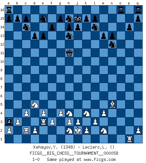 Last move : 1-0 2010 February 16 13:36:59 [Event "FICGS__BIG_CHESS__TOURNAMENT__000058"] [Site "FICGS"] [Date "2009.12.30"] [Round "1"] [White "Kehayov,Yulian"] [Black "Leclerc,Luc-Olivier"] [Result "1-0"] [WhiteElo "1348"] [BlackElo ""] 1.j2-k4 j15-h13 2.h1-o7 m15-m13 3.o7-o15 p16-o14 4.b2-b3 h16-m12 5.b1-c3 m12-p12 6.c1-b2 l16-n14 7.o15-n14 p12-n14 8.m2-m4 e15-e13 9.n2-n4 f15-f14 10.e2-e4 n14-n4 11.o2-o3 n4-c14 12.p1-q3 d15-d14 13.p2-p4 c14-o3 14.o1-m3 o3-q3 15.m3-o5 c16-o5 16.f1-e2 o5-p4 17.m1-n1 p4-l8 18.e2-l8 q3-l8 19.g1-j2 k16-l14 20.l1-o4 l8-f13 21.f2-f3 n15-n13 22.e1-e3 o16-m14 23.o4-n5 d14-d13 24.q1-p1 p15-p14 25.n1-o1 o14-n12 26.c3-d5 f16-c13 27.l2-l3 g16-e15 28.c2-c4 b16-c14 29.j2-h4 j16-j15 30.g2-g4 m16-o16 31.o1-o16 e16-o16 32.j1-j2 c13-g9 33.a1-c1 f13-h11 34.k1-m2 g9-a3 35.b2-a3 m14-a3 36.c1-c2 1-0 Follow this game move after move (download)When I have White, I win because I am white; When I have Black, I win because I am Bogolyubov. (Bogolyubov) Die Fehler sind da, Sie warten nur darauf gemacht zu werden. (Savielly Grigorievitsch Tartakower) En el Ajedrez, cuando menos, el valiente hereda la tierra. (Edmar Mednis) Un journaliste : 'Vous préférez avoir une dame de plus sur l'échiquier ou au lit ?' Boris Spassky : 'Ca dépend de la position.' Tree pose grows confidence. It roots me to this world. (Terri Guillemets)