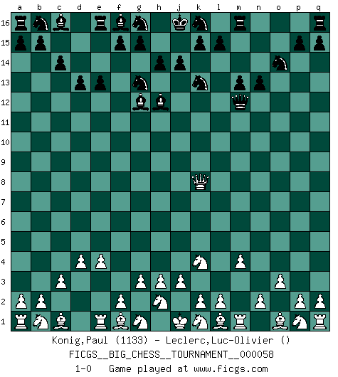 Last move : 1-0 2010 February 16 13:37:11 [Event "FICGS__BIG_CHESS__TOURNAMENT__000058"] [Site "FICGS"] [Date "2009.12.30"] [Round "1"] [White "Konig,Paul"] [Black "Leclerc,Luc-Olivier"] [Result "1-0"] [WhiteElo "1133"] [BlackElo ""] 1.j2-k4 n15-n13 2.h1-o7 h15-g13 3.o7-o15 p16-o14 4.o15-l12 j15-k13 5.o2-o3 h16-o10 6.g2-g3 m15-m13 7.l12-c12 e15-e13 8.d2-d4 l16-o13 9.e2-e4 c15-c14 10.m2-m4 d15-d13 11.c12-f9 o13-k9 12.f9-b9 k9-f13 13.b9-l9 o16-j11 14.l9-j9 j11-k10 15.j9-d9 f13-g12 16.d9-d8 o10-m12 17.c2-c3 k10-h12 18.d8-k8 1-0 Follow this game move after move (download)Only the player with the initiative has the right to attack. (Wilhelm Steinitz) Es gibt keine einzige Frau, der ich nicht einen Springer vorgeben könnte und trotzdem gewänne. (Robert James Fischer) Cuando le juegas a Fischer, no es una cuestion de si vas a ganar o perder. Es una cuestion de si vas a sobrevivir. (Boris Spassky) Même un GMI sait rarement calculer sur plus de cinq coups une attaque à sacrifices. (Rudolf Spielmann) Patience, use the Force, think ! (Obi-Wan Kenobi in Star Wars ep.2)