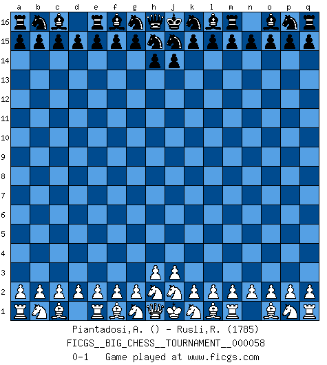 Last move : 0-1 2009 December 31 13:44:31 [Event "FICGS__BIG_CHESS__TOURNAMENT__000058"] [Site "FICGS"] [Date "2009.12.30"] [Round "1"] [White "Piantadosi,Angelo"] [Black "Rusli,Rafnizar"] [Result "0-1"] [WhiteElo ""] [BlackElo "1785"] 0-1 Follow this game move after move (download)I still hope to kill Fischer. (Boris Spassky) Über die Verhaftung Bobby Fischers: Warum es die Bush-Administration für nötig befindet einen 61 Jahre alten Mann zu hetzten, der für niemanden ausser sich selbste eine Gefahr darstellt ist ein Rätsel. (Nigel Short) No hay precio que no valga la pena por la cabellera del Rey enemigo. (Koblentz) Dans le domaine de la peinture, de la gravure et de la sculpture, dès la première décennie de notre siècle, les artistes abandonnent la représentation de la partie d'échecs pour se concentrer sur les pièces, sur les échiquiers et sur toutes les variations auxquelles les unes et les autres peuvent donner lieu. On passe en quelque sorte d'un thème social à un thème musical (au sens de la musica médiévale, c'est-à-dire d'une notion qui inclue le rythme, l'harmonie, la construction et la déconstruction, etc.). Graphiquement et picturalement, l'échiquier apparaît comme une structure ouverte, dynamique, d'une richesse infinie, autorisant toutes les combinatoires et débouchant sur des mouvements et des rythmes de nature exponentielle. (Michel Pastoureau) It's not the will to win, but the will to prepare to win that makes the difference. (Bear Bryant)
