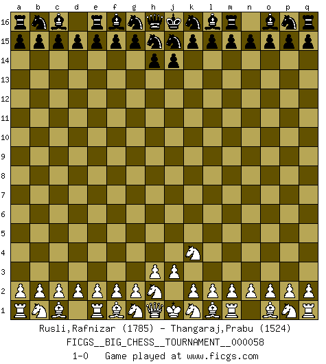 Last move : 1-0 2010 March 2 9:34:59 [Event "FICGS__BIG_CHESS__TOURNAMENT__000058"] [Site "FICGS"] [Date "2009.12.30"] [Round "1"] [White "Rusli,Rafnizar"] [Black "Thangaraj,Prabu"] [Result "1-0"] [WhiteElo "1785"] [BlackElo "1524"] 1.j2-k4 1-0 Follow this game move after move (download)Chess is in its essence a game, in its form an art, and in its execution a science. (Baron Tassilo) Schach wird sich dank seiner hohen kulturellen Tradition immer durchsetzen. In näherer Zukunft womöglich sogar als Gegenreaktion auf die maßlose Reizüberflutung im Freizeit- und Spielbereich. (Garry Kasparov) Muchos se han convertido en Maestros de Ajedrez, nadie se ha convertido en el Maestro del Ajedrez. (Siegbert Tarrasch) Les échecs sont plus proches de l'art de l'assassinat que de l'art de la guerre. (Arturo Perez-Reverte) All men can see these tactics whereby I conquer, but what none can see is the strategy out of which victory is evolved. (Sun Tzu)