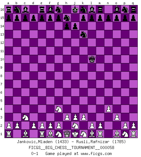 Last move : 0-1 2010 March 5 21:38:21 [Event "FICGS__BIG_CHESS__TOURNAMENT__000058"] [Site "FICGS"] [Date "2009.12.30"] [Round "1"] [White "Jankovic,Mladen"] [Black "Rusli,Rafnizar"] [Result "0-1"] [WhiteElo "1433"] [BlackElo "1785"] 1.h2-g4 j15-k13 2.o2-o3 h16-o10 3.n2-n4 o10-c10 4.k2-k3 c10-c2 5.b1-c3 c2-l10 0-1 This big chess game has been lost on time (started : 2009.12.30 23:15:38) Follow this game move after move (download)Chess is like life. (Boris Spassky) Es tut gut, die Entwicklungsperiode von, [...] demokratischem Geist durchdringen zu lassen. Wie undemokratisch wäre es doch beispielsweise, den einen Offizier große Spaziertouren vornehmen zu lassen, während die anderen zu Hause säßen und sich entsetzlich langweilten. (Aaron Nimzowitsch) Debes de llevar a tu oponente hacia un profundo y obscuro bosque donde 2+2=5, y el camino que conduce a la salida es suficientemente ancho para solamente uno. (Mikhail Tal) A chaque perte on perd un peu de soi. (Joël Lautier) After growing wildly for years, the field of computing appears to be reaching its infancy. (John Pierce)