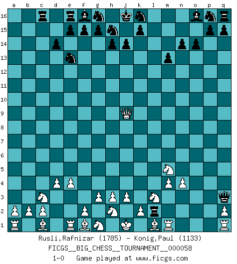 Last move : 1-0 2010 April 14 22:44:25 [Event "FICGS__BIG_CHESS__TOURNAMENT__000058"] [Site "FICGS"] [Date "2009.12.30"] [Round "1"] [White "Rusli,Rafnizar"] [Black "Konig,Paul"] [Result "1-0"] [WhiteElo "1785"] [BlackElo "1133"] 1.j2-k4 o15-o14 2.h1-o7 j15-h13 3.o7-c7 h16-o10 4.g2-g3 o10-o2 5.m2-m4 o2-o8 6.c7-l15 o8-j13 7.l15-l7 d15-d14 8.n2-n4 c16-k9 9.b1-c3 m15-m14 10.p1-q3 n15-n14 11.d2-d4 j13-o13 12.l7-j9 m14-m13 13.o1-e10 h13-k12 14.e2-e4 k12-h11 15.j9-j7 o13-o10 16.e10-f9 l16-m15 17.j7-k7 k9-q3 18.p2-q3 o10-o3 19.k7-b15 b16-d15 20.b15-c15 d15-e13 21.f9-g10 a16-c16 22.c15-a15 h11-j9 23.g10-m5 o3-q3 24.a15-a13 m15-g10 25.a13-g7 g10-m5 26.k4-m5 m16-l16 27.g7-j9 l16-l2 28.k1-l3 1-0 Follow this game move after move (download)Chess is war over the board. The object is to crush the opponents mind. (Bobby Fischer) Pläne sind die Träume des Verständigen. (Ernst Freiherr von Feuchtersleben) Aquel que toma al Peón de Caballo de la Reina, se pasará la noche a dormir en la calle. (Anónimo) En blitz, le Cavalier l'emporte sur le Fou. (Vlastimil Hort) A clear conscience is usually the sign of a bad memory. (Unknown)