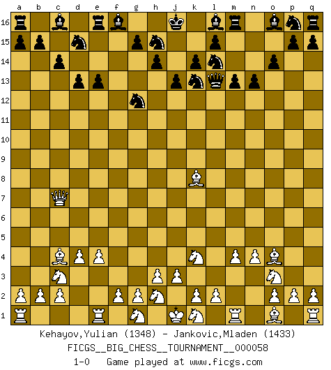 Last move : 1-0 2010 February 23 9:15:54 [Event "FICGS__BIG_CHESS__TOURNAMENT__000058"] [Site "FICGS"] [Date "2009.12.30"] [Round "1"] [White "Kehayov,Yulian"] [Black "Jankovic,Mladen"] [Result "1-0"] [WhiteElo "1348"] [BlackElo "1433"] 1.j2-k4 j15-k13 2.h1-o7 o15-o14 3.o7-f15 g16-f14 4.f15-o7 h16-l13 5.e2-e4 d15-d13 6.o7-c7 c15-c14 7.m2-m4 e15-e13 8.d2-d4 n15-n13 9.n2-n4 k15-k14 10.p1-o3 k16-l14 11.b1-c3 j14-j13 12.c1-g5 m15-m13 13.l1-o4 f14-g12 14.g5-k8 b16-d15 15.f1-c4 1-0 This big chess game has been lost on time (started : 2009.12.30 23:15:38) Follow this game move after move (download)There just isn't enough televised Chess. (David Letterman) Drei Punkte vor allen anderen ist wie einer, der im weißen Anzug posiert, während der Rest in Müllsäcke gekleidet dasteht. (Viktor Kortschnoi) Por tratar de evitar la pérdida de una pieza, muchas personas han perdido una partida de Ajedrez. (Savielly Tartakover) Horreur, mais aussi harmonie suprême : qu'y avait-il en effet au monde en dehors des échecs ? Le brouillard, l'inconnu, le non-être... (Vladimir Nabokov) The next best thing to gambling and winning is gambling and loosing. (Nick Dandalos)