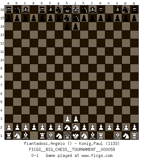 Last move : 0-1 2009 December 31 13:45:8 [Event "FICGS__BIG_CHESS__TOURNAMENT__000058"] [Site "FICGS"] [Date "2009.12.30"] [Round "1"] [White "Piantadosi,Angelo"] [Black "Konig,Paul"] [Result "0-1"] [WhiteElo ""] [BlackElo "1133"] 0-1 Follow this game move after move (download)Human affairs are like a Chess game: only those who do not take it seriously can be called good players. (Hung Tzu Ch'eng) Die unerbitterlichsten Regeln im Schach sind die Ausnahmen. (Savielly Grigorievitsch Tartakower) La maestría del Ajedrez consiste esencialmente en analizar posiciónes de Ajedrez con precisión. (Mikhail Botvinnik) Tout change constamment, y compris dans le monde des Echecs. (Botvinnik) The quality of decision is like the well-timed swoop of a falcon which enables it to strike and destroy its victim. (Sun Tzu)