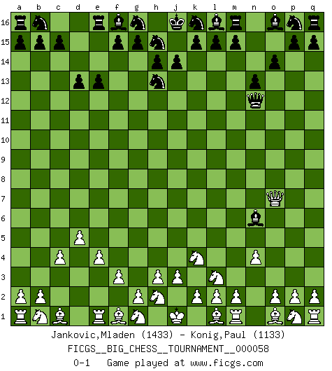 Last move : 0-1 2010 March 3 21:34:31 [Event "FICGS__BIG_CHESS__TOURNAMENT__000058"] [Site "FICGS"] [Date "2009.12.30"] [Round "1"] [White "Jankovic,Mladen"] [Black "Konig,Paul"] [Result "0-1"] [WhiteElo "1433"] [BlackElo "1133"] 1.j2-k4 o15-o14 2.c2-c4 j15-h13 3.h1-o7 e15-e13 4.d2-d4 h16-m12 5.d4-d5 n15-n13 6.n2-n4 d15-d13 7.e2-e4 m12-n12 8.k1-l3 c16-k9 9.f2-f3 k9-n6 0-1 This big chess game has been lost on time (started : 2009.12.30 23:15:38) Follow this game move after move (download)Avoid the crowd. Do your own thinking independently. Be the Chess player, not the Chess piece. (Ralph Charell) Ein guter Spieler hat immer Glück. (José Raúl Capablanca) Cuando le juegas a Fischer, no es una cuestion de si vas a ganar o perder. Es una cuestion de si vas a sobrevivir. (Boris Spassky) Les échecs c'est le défi de l'alpiniste, toujours plus haut, prêt à tout pour monter à l'assaut du Roi ennemi. Les échecs, c'est de la musique en mouvement, un ballet majestueux pour les yeux. C'est de la poésie composée par les fantômes du passé qui au même titre que Rimbaud ou Verlaine méritent notre admiration. Les échecs, c'est de la peinture ou le moindre mouvement modifie le tableau pour en faire un Picasso ou un Van Gogh. Les échecs, c'est tout et rien, c'est la vie et la mort. Jjulie33 sur le forum de France-Echecs. Memory is a complicated thing, a relative to truth, but not its twin. (Barbara Kingsolver, Animal Dreams)