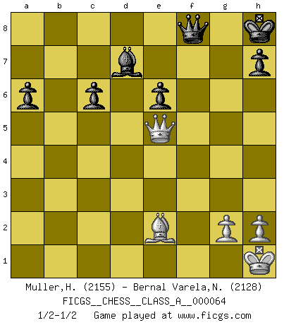 Last move : 1/2-1/2 2010 March 21 23:9:2 [Event "FICGS__CHESS__CLASS_A__000064"] [Site "FICGS"] [Date "2009.12.31"] [Round "1"] [White "Muller,Henri"] [Black "Bernal Varela,Nelson"] [Result "1/2-1/2"] [WhiteElo "2155"] [BlackElo "2128"] 1.e4 c5 2.Nf3 d6 3.d4 cxd4 4.Nxd4 Nf6 5.Nc3 a6 6.Bg5 e6 7.f4 Qb6 8.Qd2 Qxb2 9.Rb1 Qa3 10.f5 Nc6 11.fxe6 fxe6 12.Nxc6 bxc6 13.e5 dxe5 14.Bxf6 gxf6 15.Ne4 Qxa2 16.Rd1 Be7 17.Be2 O-O 18.O-O Ra7 19.Qh6 Qxc2 20.Nxf6+ Bxf6 21.Rxf6 Qc5+ 22.Kh1 Rg7 23.Qh4 Rd7 24.Qg5+ Kh8 25.Rxd7 Bxd7 26.Rxf8+ Qxf8 27.Qxe5+ Kg8 28.Qg5+ Kh8 29.Qe5+ Kg8 30.Qg5+ Kh8 31.Qe5+ 1/2-1/2 Sicilian : Najdorf, 7...Qb6 Kingside Castling by player Black (move 17) Kingside Castling by player White (move 18) This chess game ended in a draw. Follow this game move after move (download)A good player is always lucky. (Jose Raul Capablanca) Über Kasparov: Es ist offensichtlich, daß er in einem totalitären Staat aufwuchs und deshalb zu diktatorischen Zügen neigt. (Viktor Kortschnoi) Hoy en día, si tu no eres un Gran Maestro a los 14 años, es mejor que lo olvides. (Anand Viswanathan) Le pion, dans sa simplicité, marche droit devant lui, mais lorsqu'il prend, il le fait obliquement? Ainsi l'homme, tant qu'il reste pauvre, marche dans la droiture et vit honnêtement, mais lorsqu'il recherche les honneurs, il flatte, se parjure et, par les voies obliques, cherche une position supérieure sur l'échiquier du monde. (Jean de Galles) Art disturbs, science reassures. (Georges Braque, Le Jour et la Nuit)