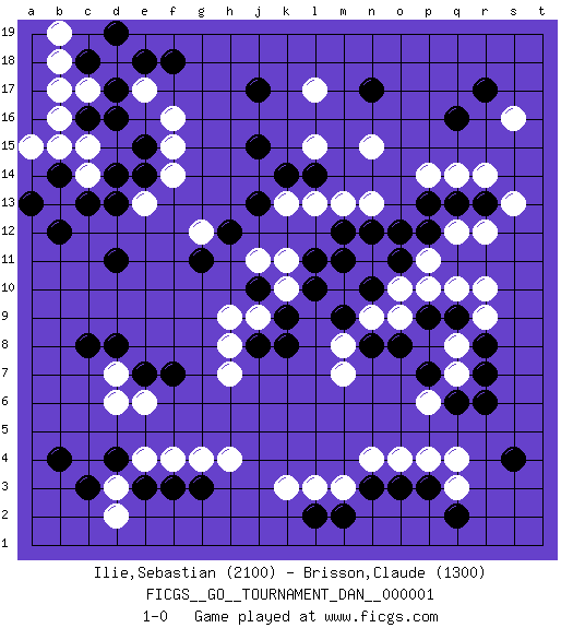 Last move : 1-0 2006 November 17 17:52:46 [Event "FICGS__GO__TOURNAMENT_DAN__000001 "] [Site "FICGS"] [Date "2006.10.14"] [Round "1"] [Black "Ilie,Sebastian "] [White "Brisson,Claude "] [Result "1-0"] [Rating 1 "2100"] [Rating 2 "1300"] 1.q16 q4 2.d4 c17 3.d14 f16 4.d11 r14 5.n17 s16 6.r17 r10 7.o3 m3 8.r6 o4 9.p3 p4 10.n3 n4 11.m2 l3 12.l2 k3 13.s4 q3 14.q2 q7 15.q6 p6 16.r7 q8 17.j17 d6 18.c8 e4 19.e3 f4 20.f3 g4 21.g3 h4 22.e7 d7 23.d8 e6 24.f7 d3 25.c3 d2 26.b4 h7 27.k8 j9 28.j8 h8 29.k9 k10 30.j10 h9 31.l10 k11 32.m9 m8 33.m12 l17 34.f18 l15 35.j15 k13 36.k14 l13 37.l14 m13 38.n12 n13 39.o12 p14 40.n8 m7 41.p9 p11 42.p12 q12 43.q9 r9 44.r8 o10 45.p7 n9 46.n10 o9 47.q13 r12 48.p13 q14 49.r13 s13 50.o8 p10 51.o11 q10 52.l11 e13 53.d13 j11 54.m11 c15 55.e14 f14 56.d16 e17 57.d17 d18 58.c16 b17 59.e18 b16 60.e15 f15 61.c18 b18 62.d19 b13 63.b12 b19 64.b14 c14 65.c13 b15 66.a13 a15 67.j13 n15 68.h12 g12 69.g11 1-0 Here are the names of the openings (joseki) played in the four corners : Corner d16 : c17 d14San-San (Sam-Sam, San-San) 3-3 Point. The San-San (3-3) point, emphasizing territory at the expense of influence.Nikken Takagakari (Dukan Nop'dakeolch'im, E`r Gaogua`jiao~, 2-Space High Approach). White may continue with 4-5 or 4-6. White 4-6 works well when White is in the lower right (so an extension in the middle works both ways). The more conservative 4-5 is makes a slightly tighter shape (better for a fight). Corner q16 : q16 r14Hoshi (Hwajeom, Seongjeom, Xingwei`) 4-4 Point. The star or hoshi (4-4) point, emphasizing influence at the potential expense of territory.Ikken Kakari (Hankan Keolch'im, Yi Gua`jiao~, 1-Space Low Approach). White 2 is the standard approach move to the 4-4. Corner q4 : q4 o3Hoshi (Hwajeom, Seongjeom, Xingwei`) 4-4 Point. The star or hoshi (4-4) point, emphasizing influence at the potential expense of territory.Ikken Kakari (Hankan Keolch'im, Yi Gua`jiao~, 1-Space Low Approach). Black 2 is the standard approach move to the 4-4. Corner d4 : d4 d6Hoshi (Hwajeom, Seongjeom, Xingwei`) 4-4 Point. The star or hoshi (4-4) point, emphasizing influence at the potential expense of territory.Ikken Takagakari (Hankan Nop'dakeolch'im, Yi Gaojia, 1-Space High Approach). Black typically responds at 6-4 or 3-10. Black 4-10 is played when Black finds play on the right side advantageous. Black 4-8 or 3-8 may be played when Black has support at top. Player Black won this Go (weiqi, baduk) game.Follow this game move after move (download ) Territory is a closed space where time no longer exists. The transformation around it slower alter it, and sometimes it cracks open like a rotten egg at the least shock. (Pierre Audouard) Over-the-board chess is the favorite of mortals, correspondence chess is the favorite of the gods. (Eduard Dyckhoff)