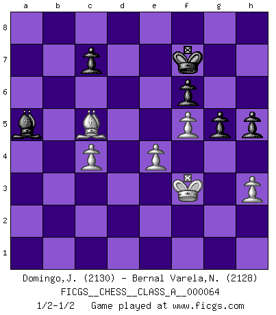 Last move : 1/2-1/2 2010 July 22 22:2:12 [Event "FICGS__CHESS__CLASS_A__000064"] [Site "FICGS"] [Date "2009.12.31"] [Round "1"] [White "Domingo,Jordi"] [Black "Bernal Varela,Nelson"] [Result "1/2-1/2"] [WhiteElo "2130"] [BlackElo "2128"] 1.b4 e5 2.a3 d5 3.Bb2 a5 4.Bxe5 Nc6 5.Bb2 axb4 6.Nf3 Nf6 7.e3 Bf5 8.Bb5 Bd6 9.axb4 Rxa1 10.Bxa1 O-O 11.Bxc6 bxc6 12.O-O Bxb4 13.d3 c5 14.Nbd2 Qe7 15.Be5 Ne4 16.dxe4 dxe4 17.Qa1 exf3 18.Nxf3 f6 19.Bg3 Qe4 20.c3 Ra8 21.Qb2 Ba5 22.Nd2 Qd5 23.Ra1 Bb6 24.Rxa8+ Qxa8 25.Qb3+ Kh8 26.h3 h6 27.Qc4 Qd8 28.e4 Bxh3 29.gxh3 Qxd2 30.Qe6 Qd8 31.c4 Qg8 32.Qxg8+ Kxg8 33.f4 g6 34.f5 Kf7 35.Kg2 h5 36.Kf3 Ba5 37.Bf2 g5 38.Bxc5 1/2-1/2 Polish (Sokolsky) opening Kingside Castling by player Black (move 10) Kingside Castling by player White (move 12) This chess game ended in a draw. Follow this game move after move (download)Could we look into the head of a Chess player, we should see there a whole world of feelings, images, ideas, emotion and passion. (Alfred Binet) Kombinieren und Schwarzhandel gehören verboten. (Savielly Grigorievitsch Tartakower) ¡Examina movidas que hagan daño! Un buen ojo for movidas desvastantes es mucho mas importante que el conocimiento de principios estratégicos. (Purdy) Un millionnaire : 'Monsieur Steinitz ! Vous ne participez aux tournois que pour l'argent, alors que moi je n'y viens que pour l'honneur.' Steinitz : 'Chacun joue pour ce qu'il n'a pas'... It's not a bug - it's an undocumented feature. (Anonymous)