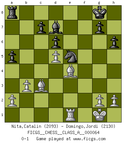 Last move : 0-1 2010 August 13 10:37:33 [Event "FICGS__CHESS__CLASS_A__000064"] [Site "FICGS"] [Date "2009.12.31"] [Round "1"] [White "Nita,Catalin"] [Black "Domingo,Jordi"] [Result "0-1"] [WhiteElo "2093"] [BlackElo "2130"] 1.e4 e5 2.Nf3 f5 3.Nxe5 Qf6 4.d4 d6 5.Nc4 fxe4 6.Nc3 Qg6 7.f3 exf3 8.Qxf3 Nf6 9.Bd3 Qg4 10.Qe3+ Be7 11.Nb5 Qd7 12.O-O O-O 13.Bd2 a6 14.Nc3 Nc6 15.Rae1 b5 16.Na5 Nxa5 17.Qxe7 Nc6 18.Qe2 Qg4 19.Qxg4 Bxg4 20.Bg5 b4 21.Ne4 Nxe4 22.Bxe4 Bd7 23.Bd2 a5 24.c3 h6 25.b3 Rxf1+ 26.Rxf1 Re8 27.Re1 bxc3 28.Bxc3 Ra8 29.d5 Ne5 0-1 Latvian counter-gambit Kingside Castling by player White (move 12) Kingside Castling by player Black (move 12) Player Black won this chess game. Follow this game move after move (download)Though most people love to look at the games of the great attacking masters, some of the most successful players in history have been the quiet positional players. They slowly grind you down by taking away your space, tying up your pieces, and leaving you with virtually nothing to do ! (Yasser Seirawan) Sitze auf Deine Hände. (Siegbert Tarrasch) En la vida, como en el Ajedrez, los Peones propios obstruyen nuestro camino. La gran fortuna de un hombre, su comodidad, placer, hijos, libros, que deberían ayudarle a ganar, con mucha frecuencia lo ponen en Jaque Mate. (Charles Buxton) Aux échecs, l'amour-propre est satisfait quand on remporte la victoire, mais il n'y a pas de honte à être battu. (Benjamin Franklin) Without enthusiasm, virtue functions not at all, and vice only poorly. (Mignon McLaughlin, The Neurotic's Notebook, 1960)